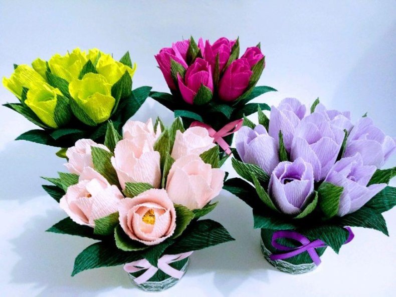 Освоив изготовление разных бутонов из гофрированной бумаги и конфет, можно собирать любые букеты.