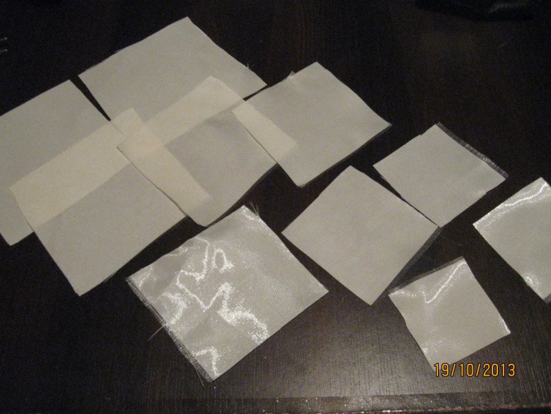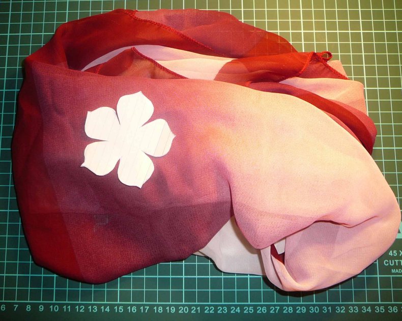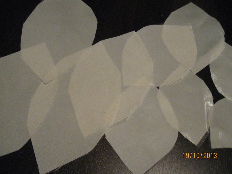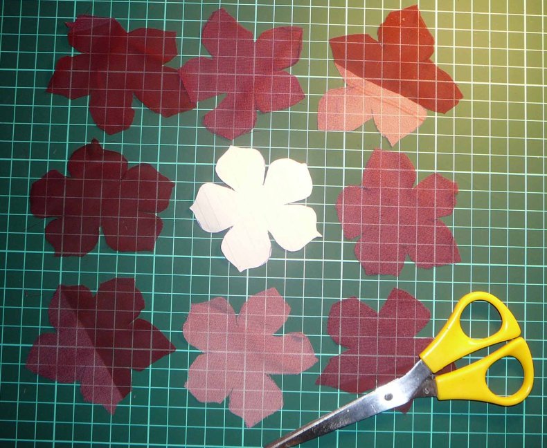 - Сложить полоски ткани так, чтобы длина и ширина совпадала с шаблоном. Вырезать лепестки из ткани по шаблону.
