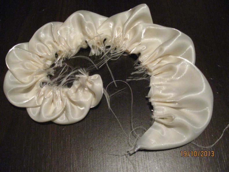 - Нижнюю часть полосок сшить наметочным швом, хорошенько стянуть. Закрепить основание цветка стежками.