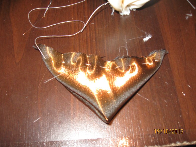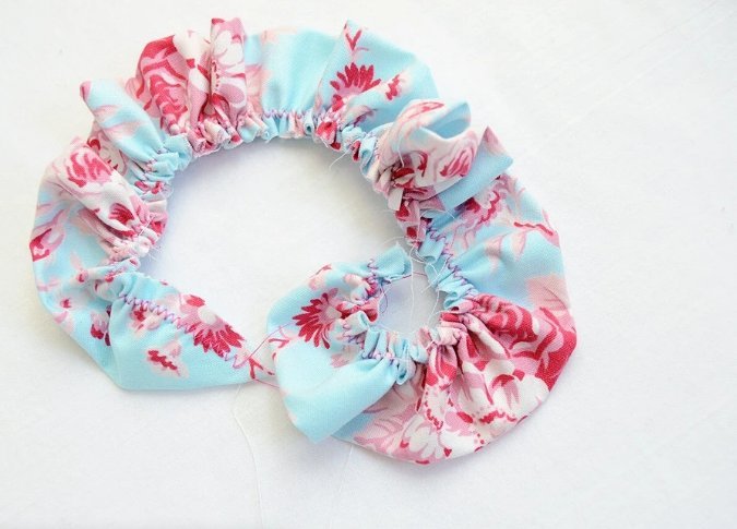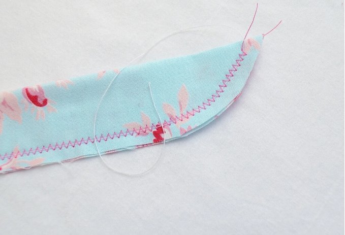 - При помощи иглы и толстой нити собрать полоску ткани в гармошку: прошить полоску наметочным швом.
