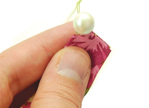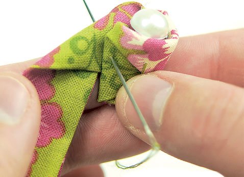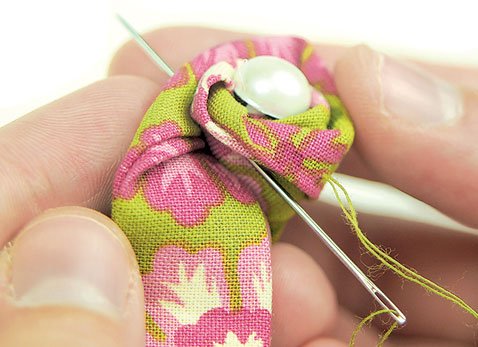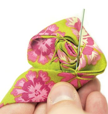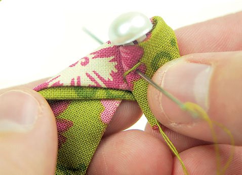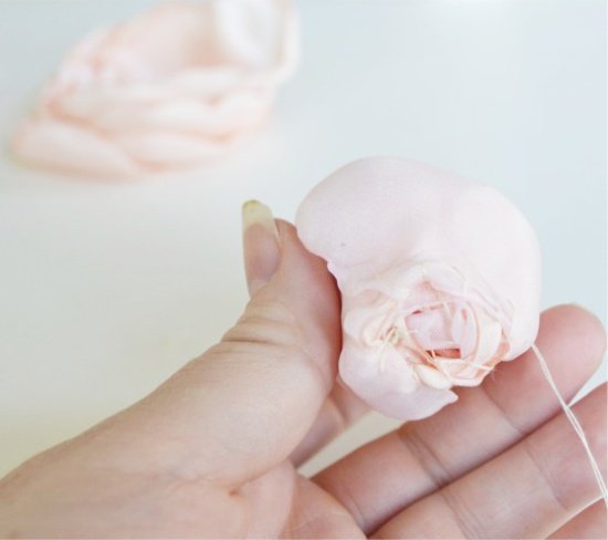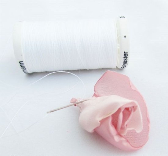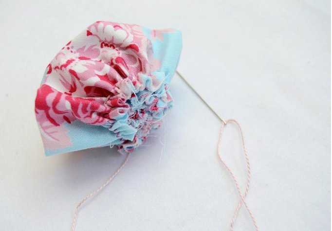 - Стянуть нить как можно туже, зашить цветок несколькими стежками.