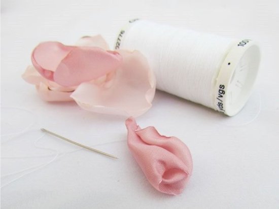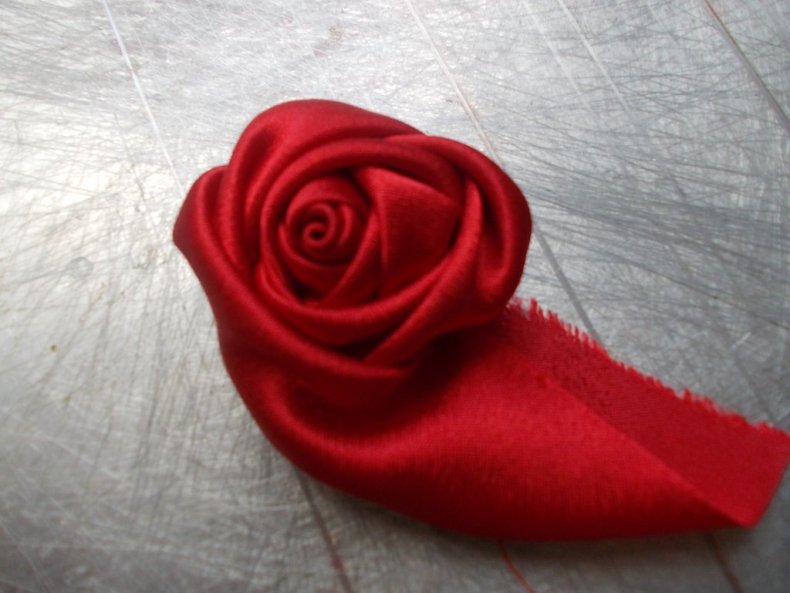 - Сформировать лепестки: сложить ленту наискось и продолжать сворачивать рулет. На один оборот вокруг центра цветка должно приходиться около пяти косых загибов ленты. Для прочности полоску ткани необходимо пропитывать клеем во время формирования рулета.