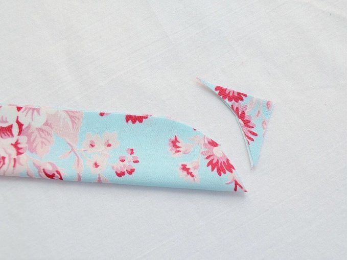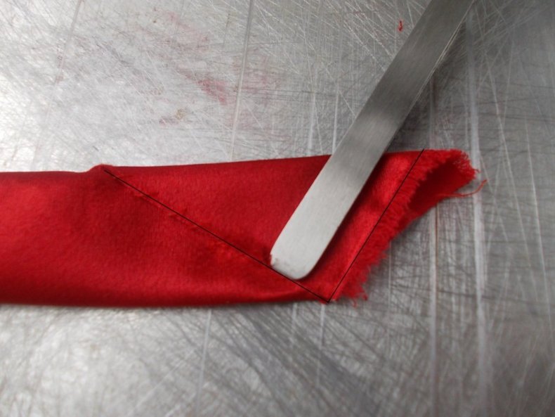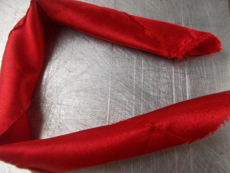 - Сложить вдвое полоску ткани изнаночной стороной внутрь. Скруглить уголки полоски ножницами.