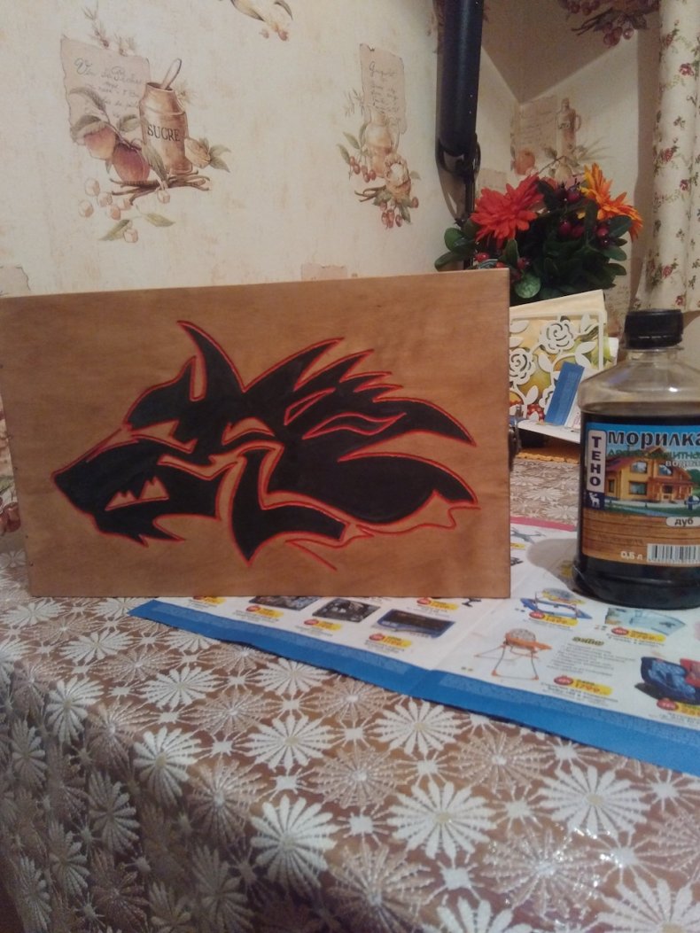 - Далее наносят лак на ключницу. После высыхания наносят еще 4 раза лак. Таким образом рисунок хорошо будет держаться. По контуру наносят черную краску.