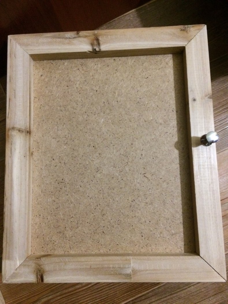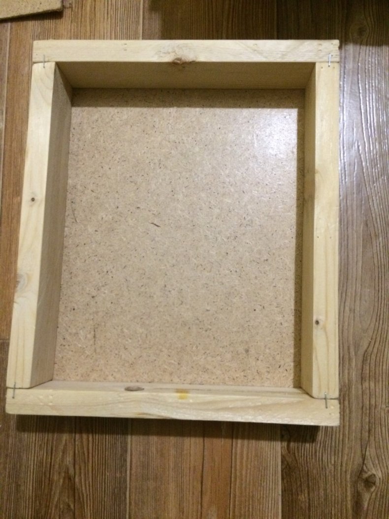 Берут рамку для картины. С задней стороны закрепляют основание, на которое будет крепиться к стене. Прикреплять лучше всего с помощью скоб. Также можно воспользоваться клеем Моментом.