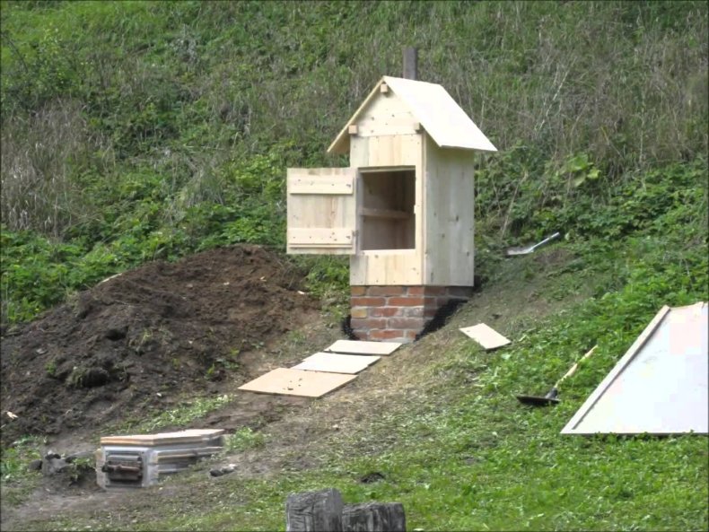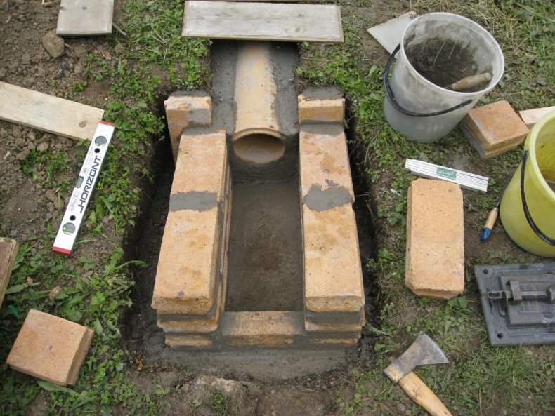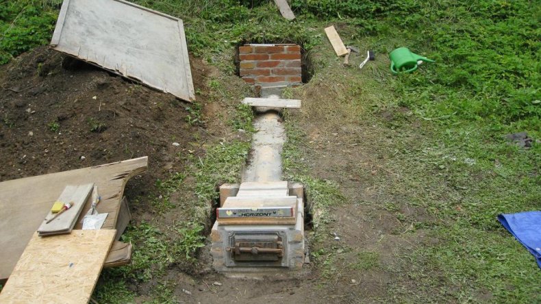 - Далее, делаем канал для дымохода. Его расстояние должна быть не менее 1,5 м от зоны коптильни.
