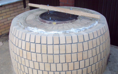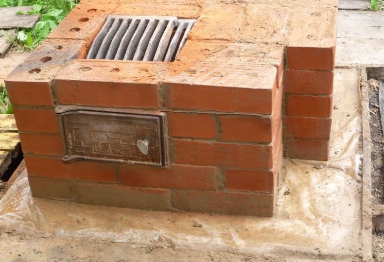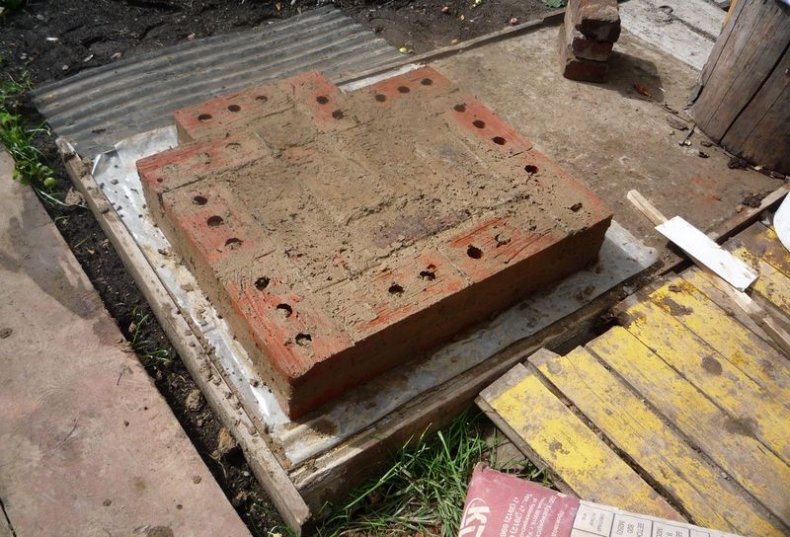 Когда фундамент полностью высохнет можно осуществлять кирпичную кладку сверху него. Если для работы будет использоваться металлический короб, то в структуре фундамента делают сквозные отверстия для монтажа металлической арматуры.