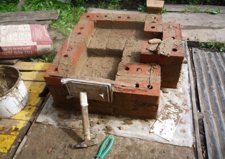 Сооружаем геометрическую топку. Её изготовим из кирпича или воспользуемся металлическим коробом. После чего аккуратно соединим топку с дымоходом.