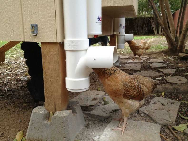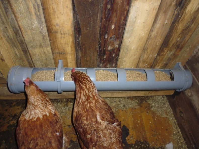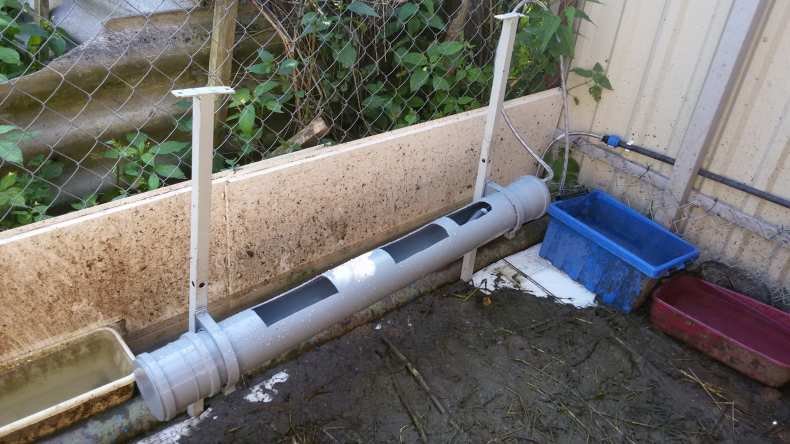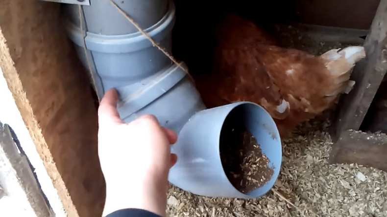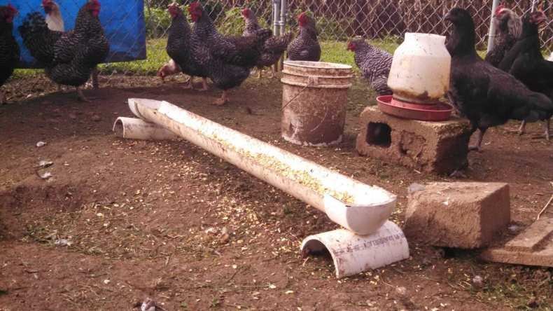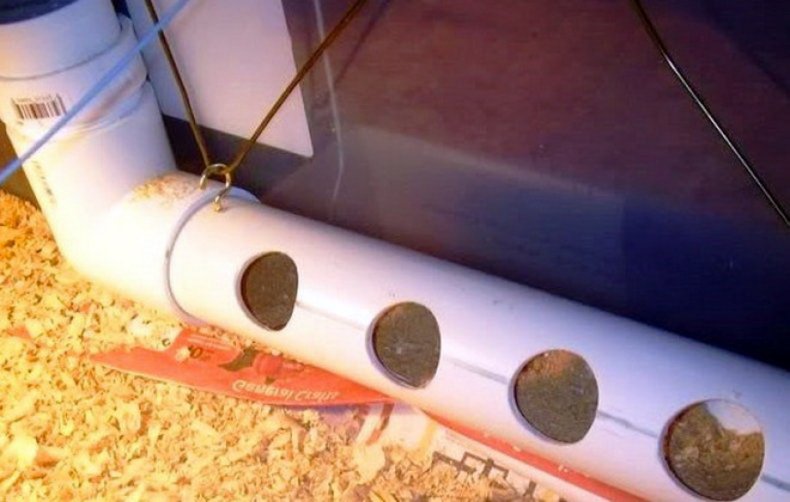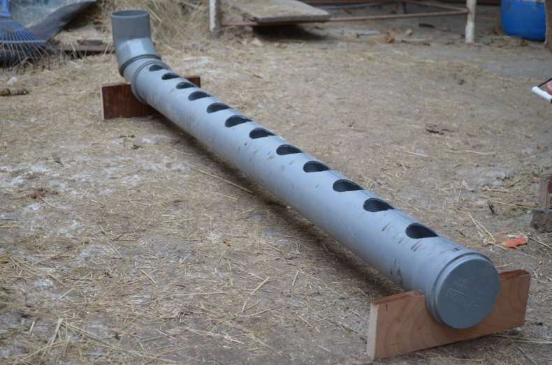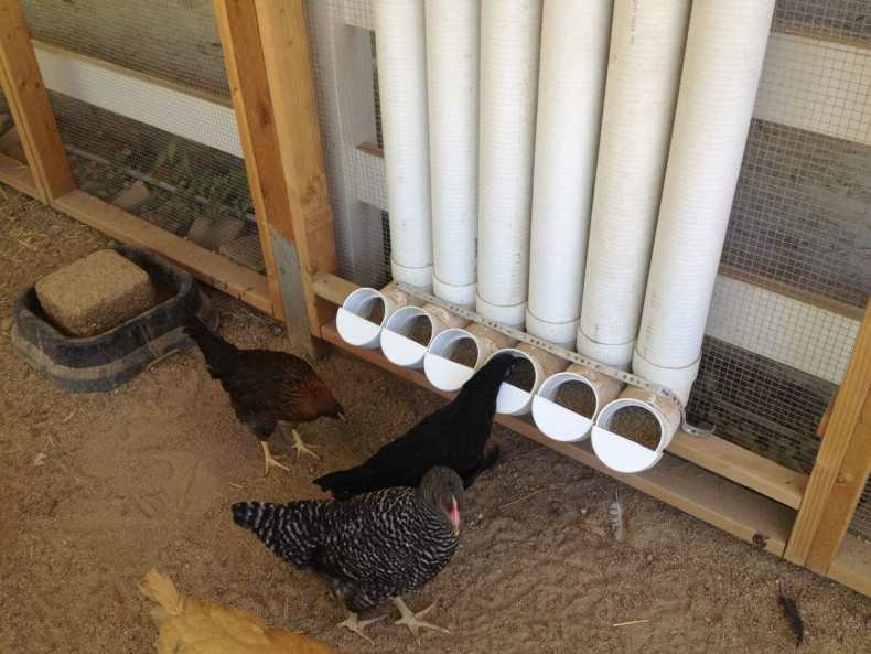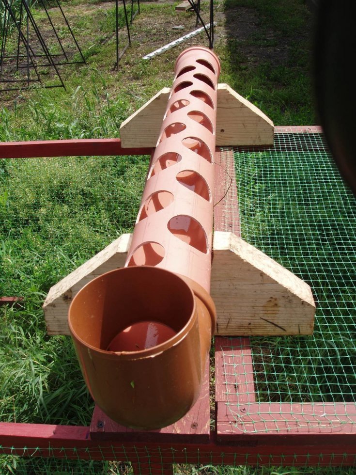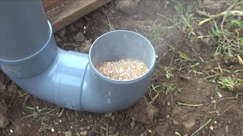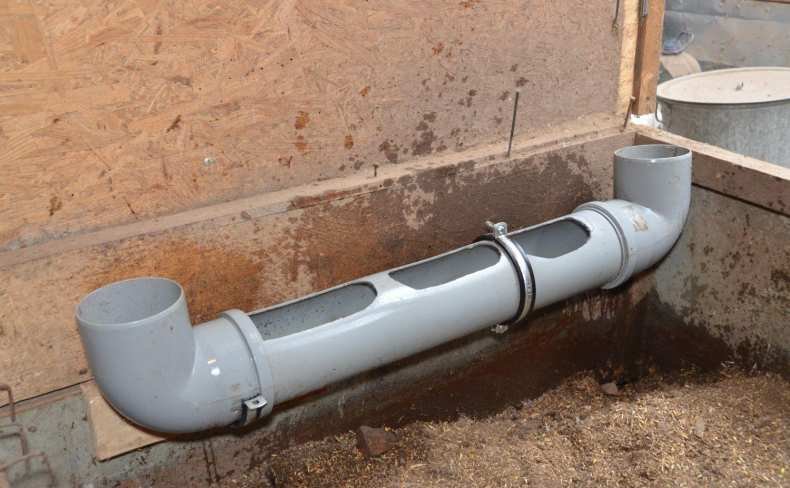 - Поставленные вертикально в ряд пластиковые трубы (несколько штук), имеющих внизу изогнутые колена. Сверху поступает различный корм – отличный вариант организации питания.