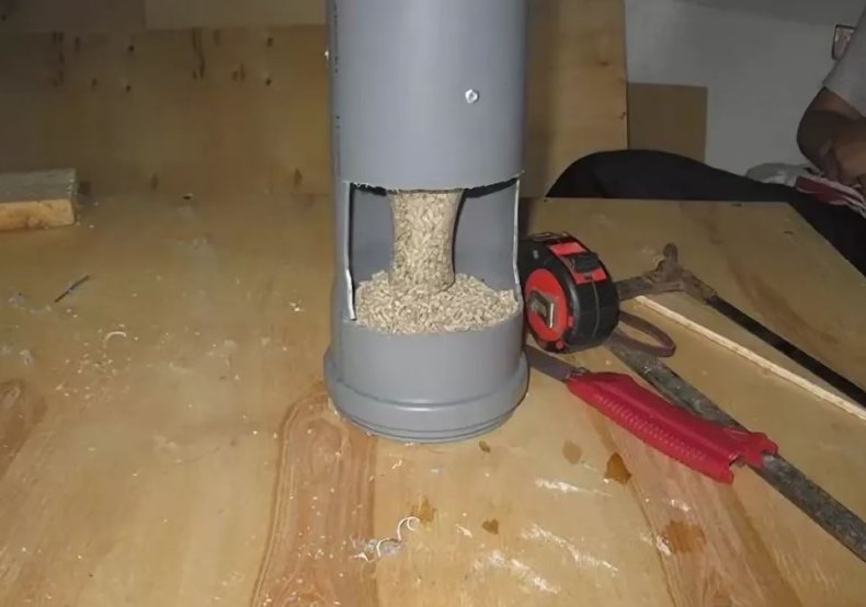 - Посередине высверлите полость, в которую вертикально вставьте отрезок другой трубы – там будет храниться основная масса корма. Пища будет постепенно поступать в горизонтальную емкость.