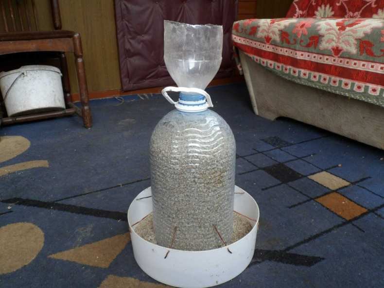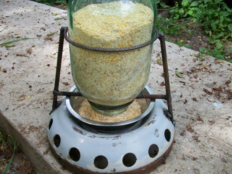 Если в хозяйстве небольшое поголовье, то насыпьте зерно в 3-литровую банку, накрыть её секционной миской, так, чтобы между верхом банки и миской оставалось расстояние в пару сантиметров. Переверните приспособление. Корм из банки будет постепенно насыпаться в секционную миску.