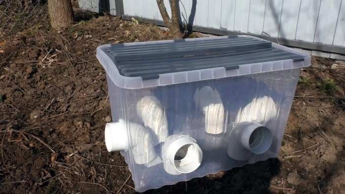 - Вертикальную трубу можно устанавливать не в середине горизонтальной, а по ее краям, а вместо заглушек воспользоваться соединительным коленом – при таком способе еда поступает с двух концов.