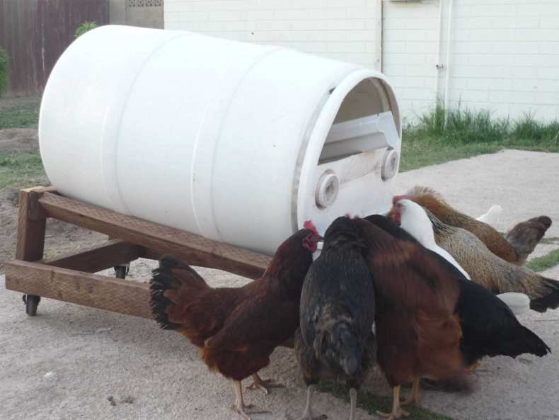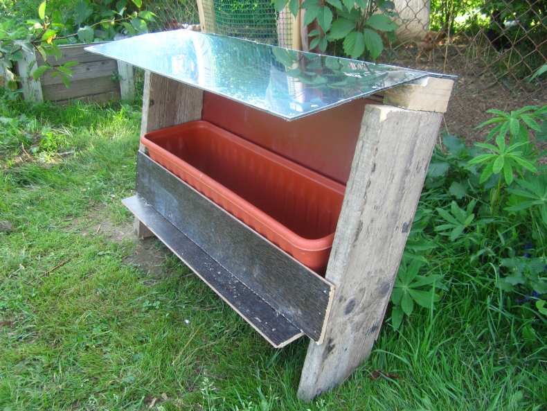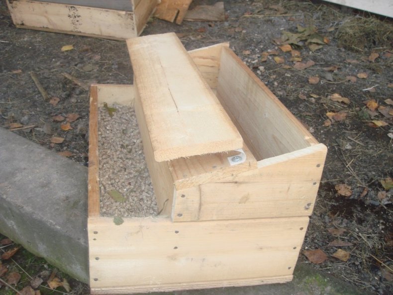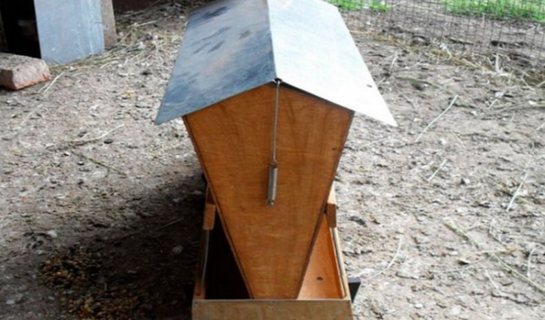 Такое приспособление легко транспортировать, переставлять с одного места на другое, но если кормушка находится на улице, и наступил дождь, то ее нужно уносить в птичник или другое крытое место.