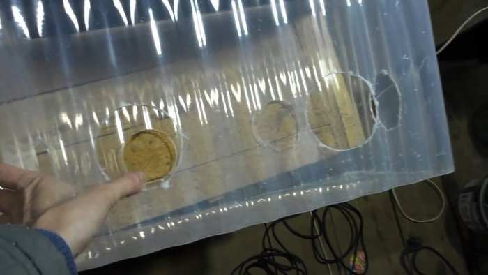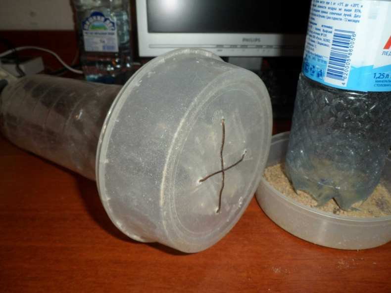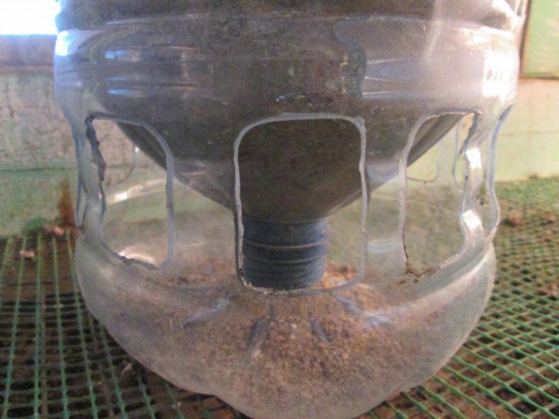 - Одну бутылку разрежьте на 2 половины. В одной половине (нижней, где имеется дно), вырежьте небольшие отверстия такого размера, чтобы курица могла беспрепятственно просовывать внутрь голову.