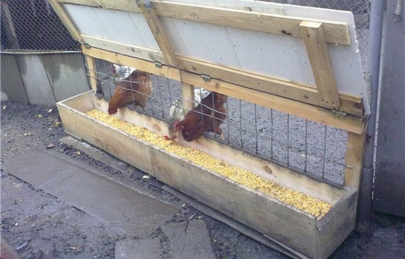 - Рациональное расходование пищи. Место кормления должно следует обустраивать таким способом, чтобы зерно, комбикорм и другая еда не разбрасывалась курами. Комбикорм не должен просыпаться на пол и землю, смешиваясь с отходами жизнедеятельности. Чтобы защитить основную массу пищи, применяются различные элементы конструкции: наличие бортиков и перемычек, натянутая сетка и проч.