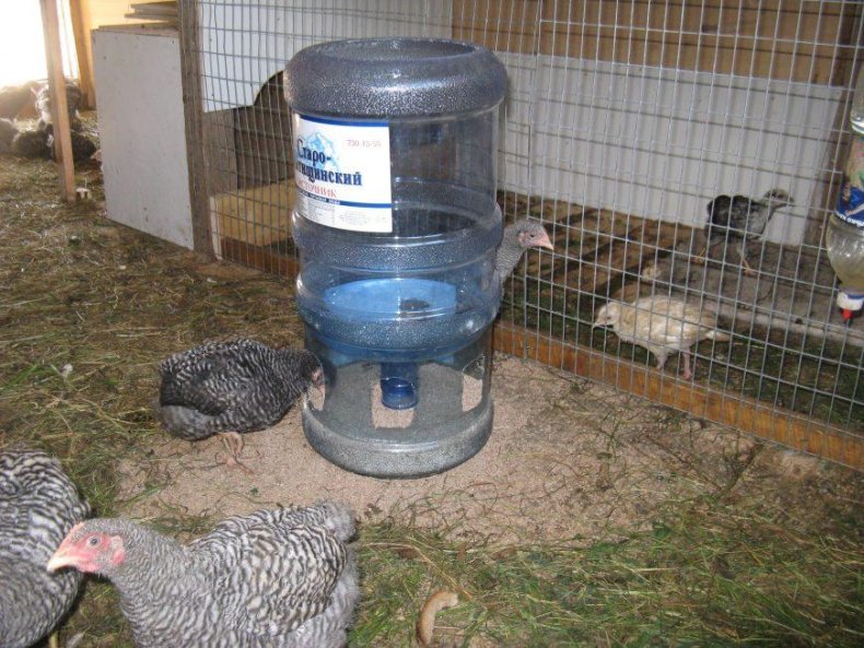 Простой и низко бюджетной является устройство, выполненное из пластиковой канистры. На ней по бокам высверливаются полости, размер в диаметре составляет примерно 5 см для того, чтобы пернатые могли просунуть голову.