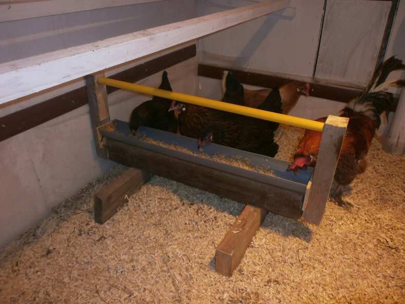 Если содержится большое количество кур, то кормушки должны быть достаточной тяжести, выполненными из досок оптимальной толщины, чтобы куры не опрокинули.
