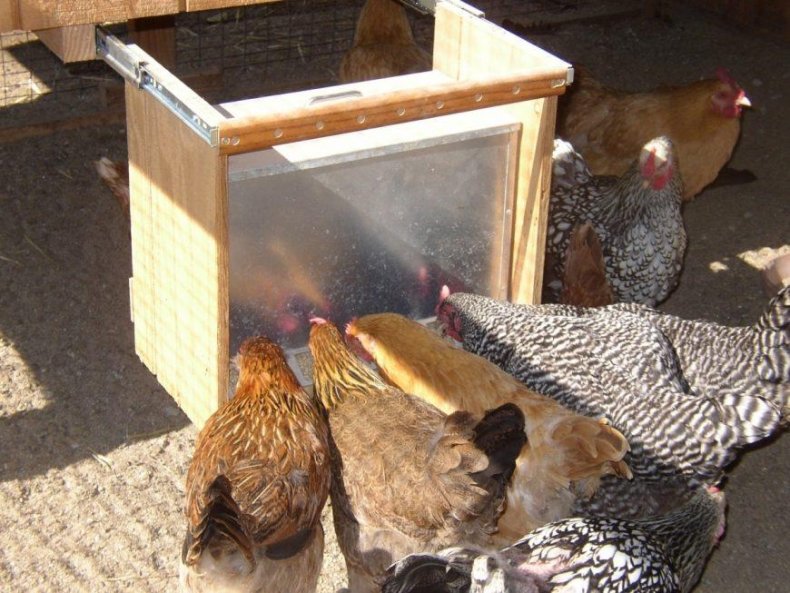 В таких устройствах имеются ограничители в виде вертушки либо съемной решетки. Такой вариант позволяет выделить для каждой курицы свой отсек.