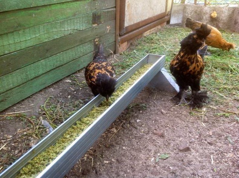 Важно! Обустраивая место кормления продолговатой формы (например, лоток), следует отводить для взрослых кур от 10 до 15 см, молодняку (цыплятам) хватает 5 см.