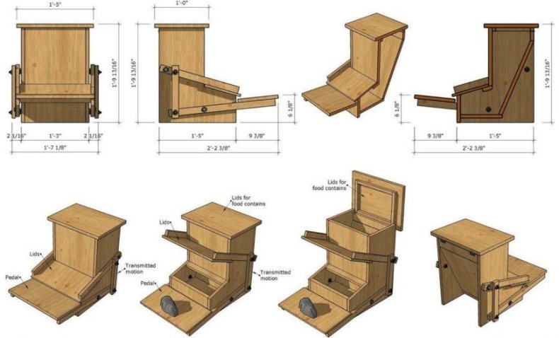 - Экономным в плане занимаемого места является устройство, выполненное из деревянных деталей и оборудованное педалью – на неё запрыгивают пернатые и, вследствие надавливания на данный элемент лоток с пищей будет открываться, позволяя спокойно кормиться.
