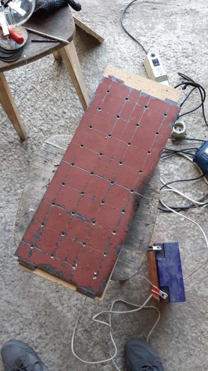 - В днище короба сверлим отверстия для подачи воздуха, а в стенках прорезаем подувала. Соблюдаем одинаковую дистанцию между отверстиями — 60 мм. Чтобы кислород входил равномерно, два ряда отверстий создаем в шахматном порядке. Расстояние от нижнего к верхнему — 30 мм.