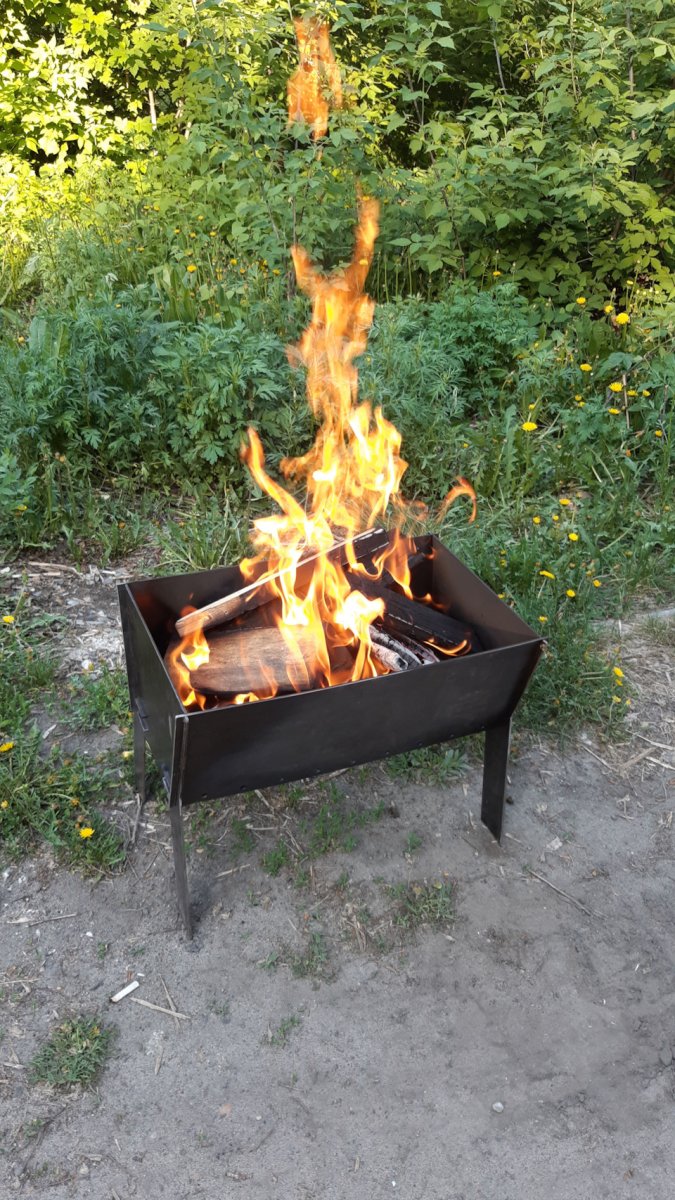 - Одноразовая — быстрое создание мангала из любых попавшихся пригодных материалов: от жестяной банки до П-образных металлических профилей.