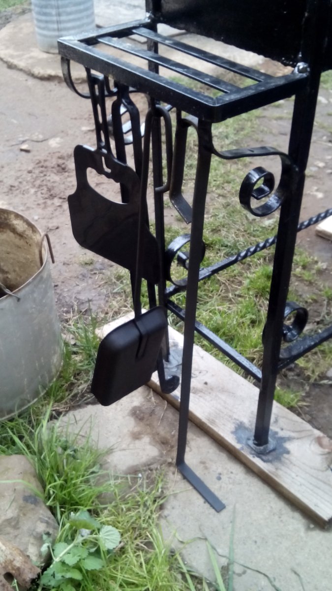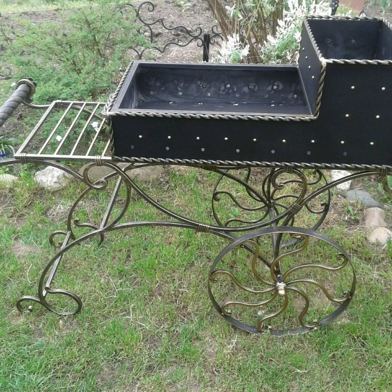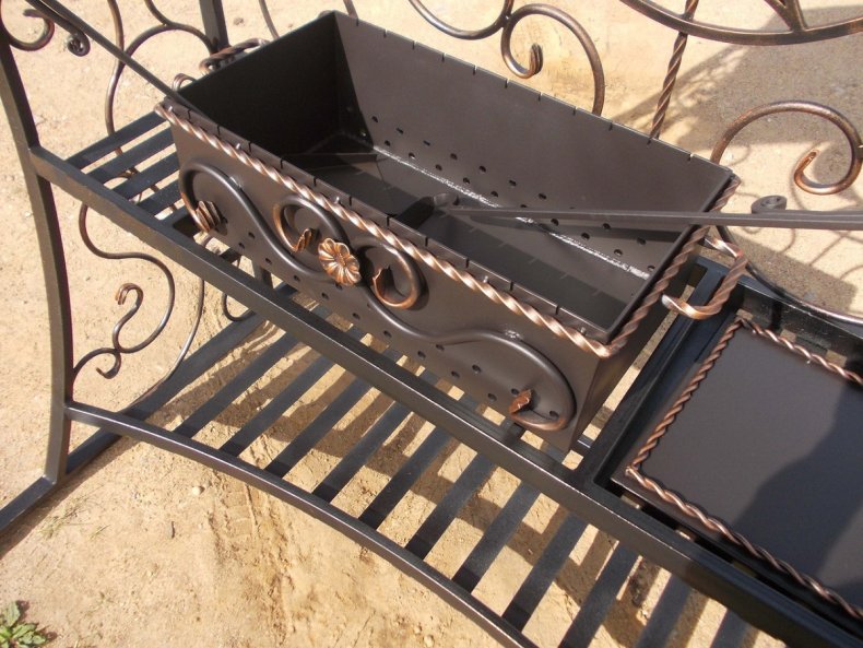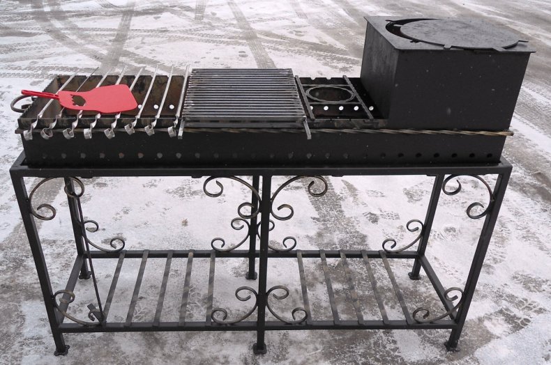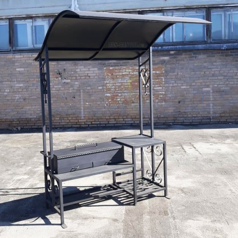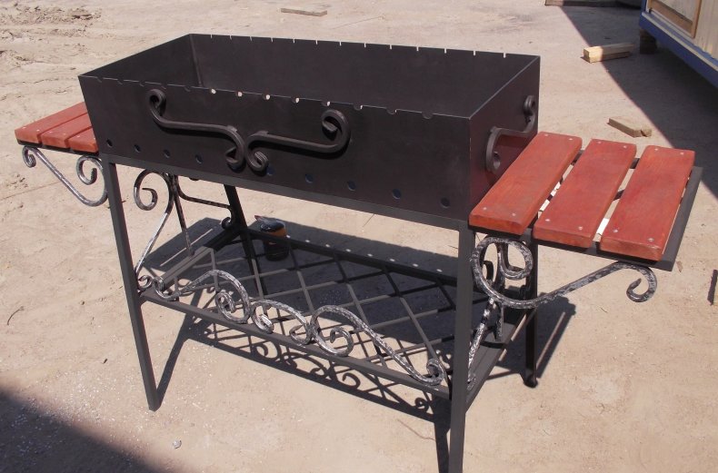 - Простые изделия украшаются витиеватой ковкой, что послужит дополнительными крючками — на них вешаются шампуры и сетки. Сооружают конструкцию с крышей и дополнительными полками.