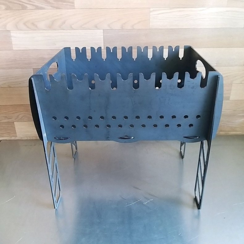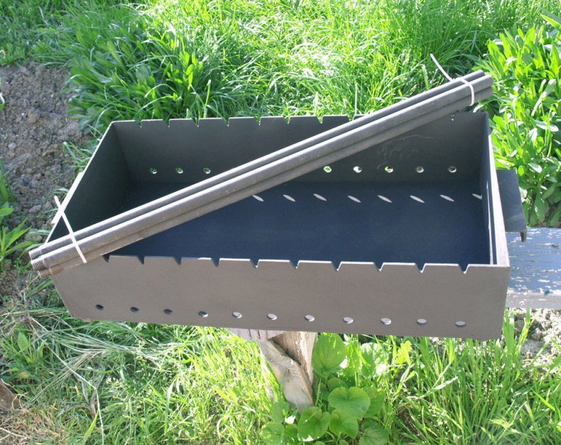 - Складная — оригинальная металлическая модель, которую всегда удобно хранить в багажнике автомобиля. Изделие напоминает чемодан, внутри которого находятся шампуры, ножки и другие необходимые вещи.