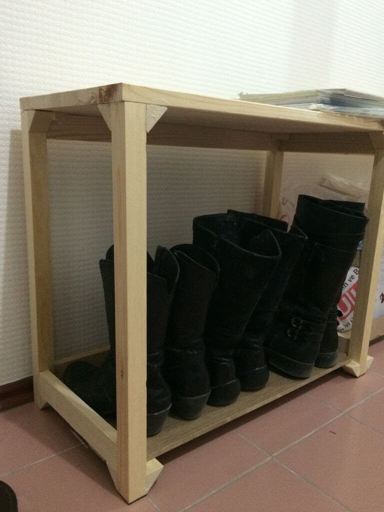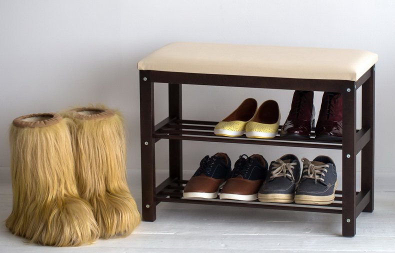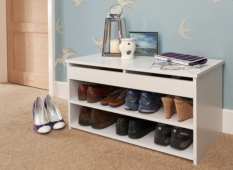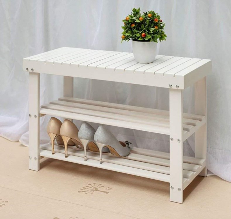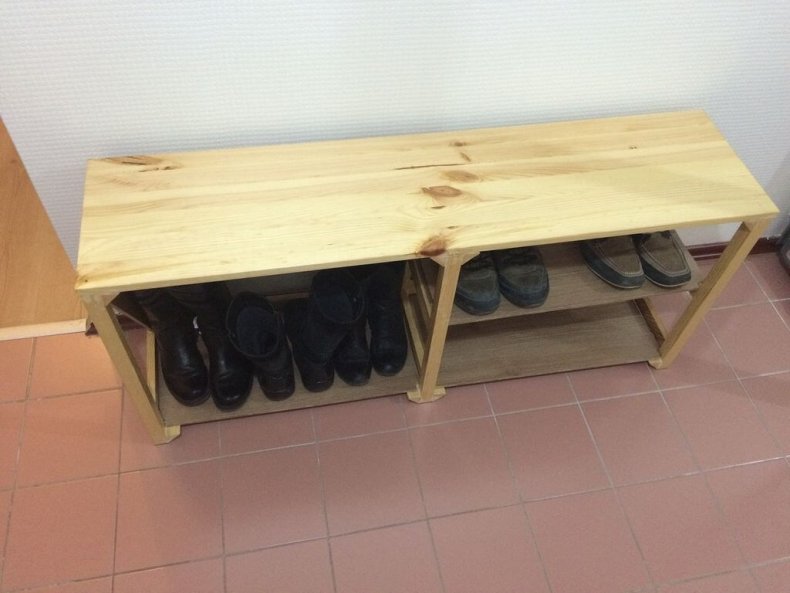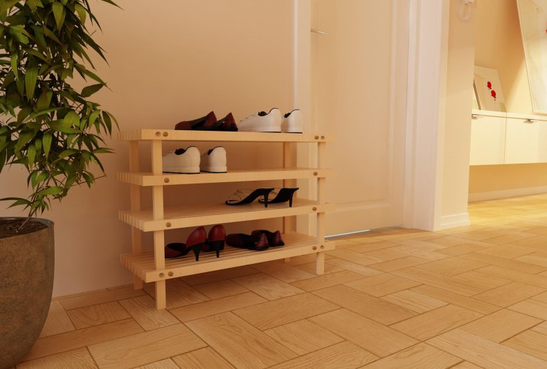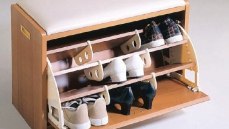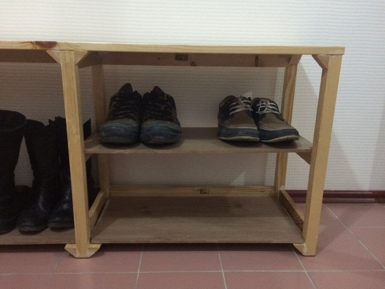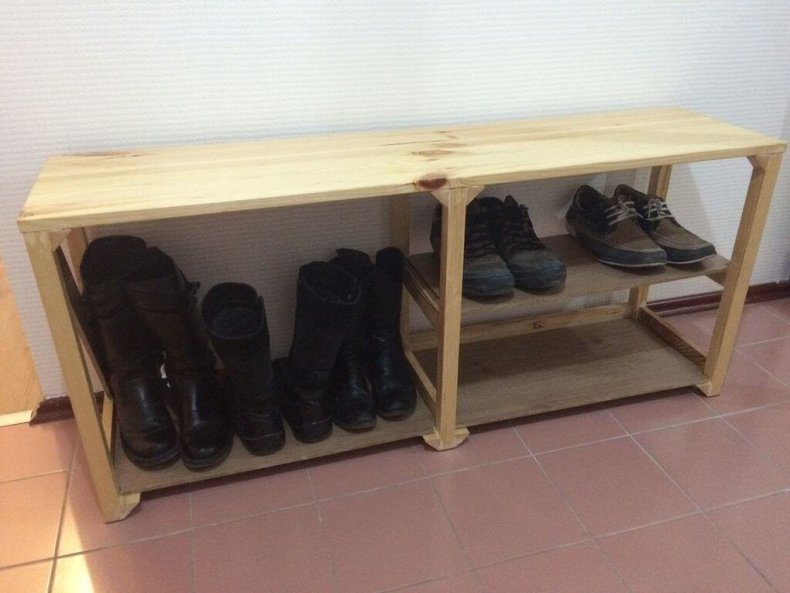 Наименее затратный вариант из всех возможных. К минусам можно отнести то, что конструкция не предназначена для тяжелых ботинок и сапог, а скорее для размещения лёгкой летней обуви, такой как – шлёпанцы, кеды, балетки.
