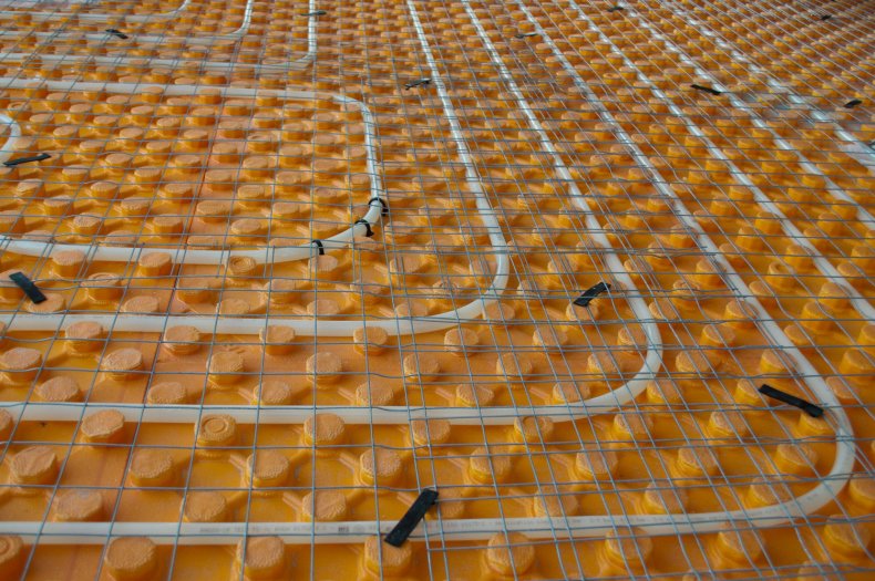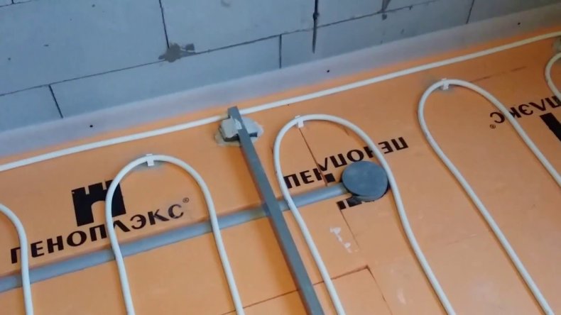 Пена (сразу после нанесения) обладает клеящими свойствами. С ее помощью фиксируют плиты из пенопласта. Его можно заменить фольгированным полиэтиленом и утеплителем, который уже оснащен каналами под укладку труб.
