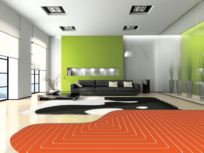 Теплый пол функционирует иначе. Благодаря тому, что нагревательные элементы располагаются по всему периметру, площадь нагрева значительно увеличивается. Температуру воздуха регулируют с помощью программы «Умный дом» или специального датчика.