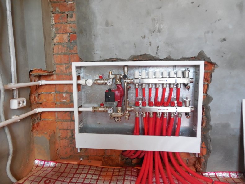 - Монтаж коллекторной группы. В нее входит коллектор, коллекторный шкаф и датчики. Толщина последнего составляет 12 см. Остальные габариты определяют, ориентируясь на параметры помещения и технические характеристики установки. Ящик размещают выше уровня подогрева. Сборку группы осуществляют по инструкции, которая к ней прилагается. Под коллектором оставляют зазор для труб.