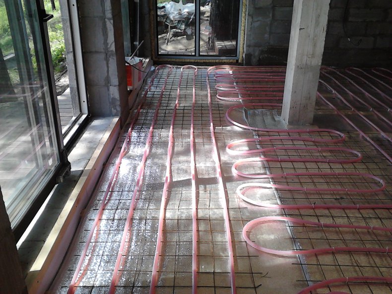 Теплый пол отличается довольно простой конструкцией. Систему укладывают на основание и заливают раствором, изготовленным из песка и цемента. Готовую стяжку покрывают плиткой, ламинатом или линолеумом.