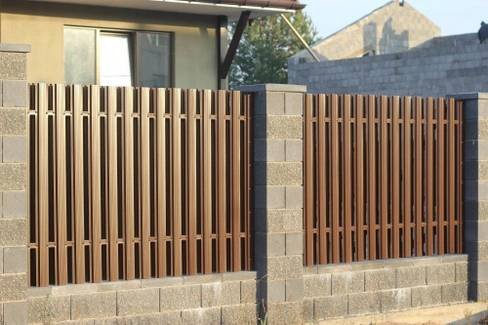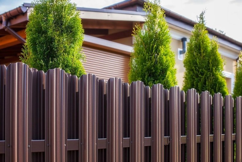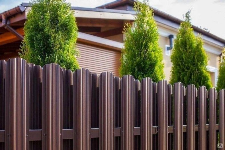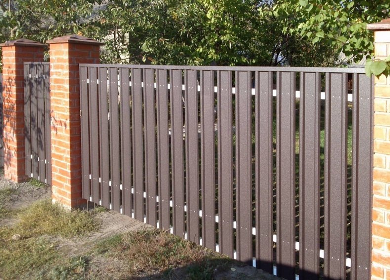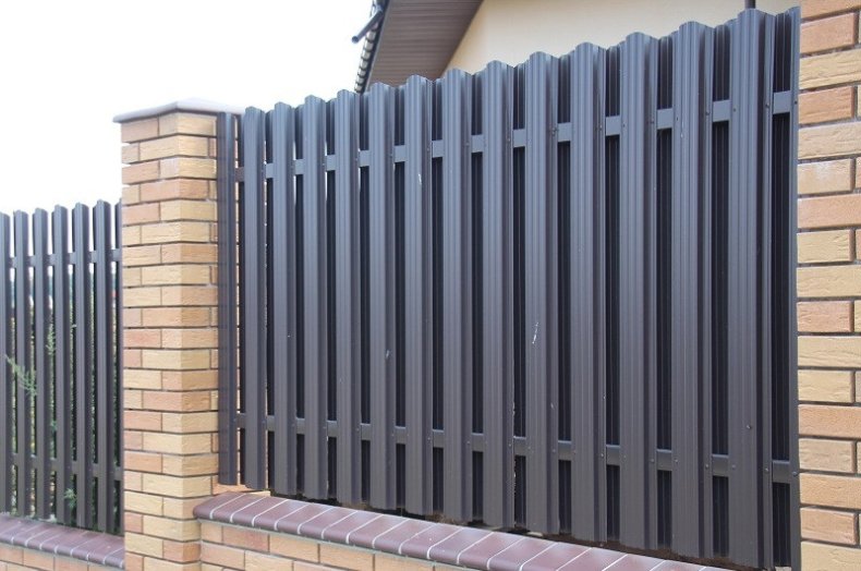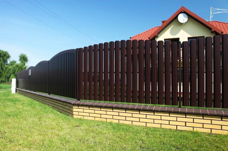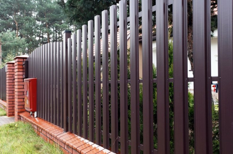 Рейки проработанной формы из металла, иногда из пластика, называются евро штакетником. Данный забор выглядит красиво и современно. Он не требует траты сил, времени и средств на уход.