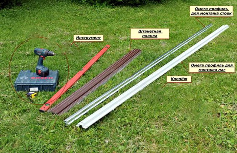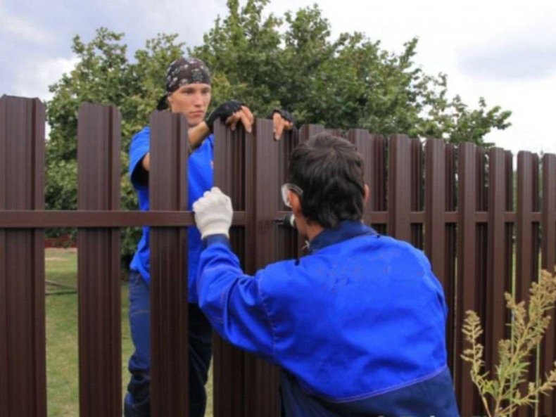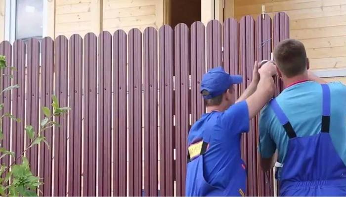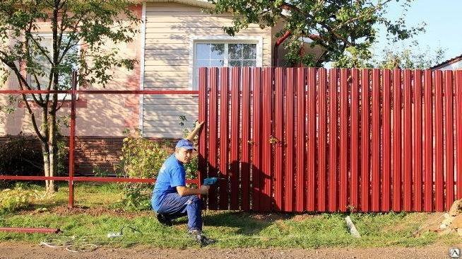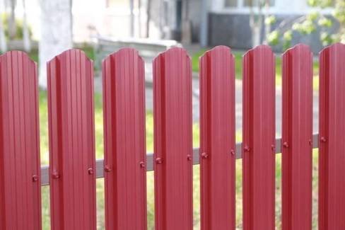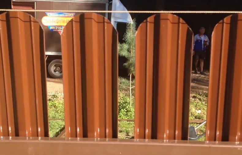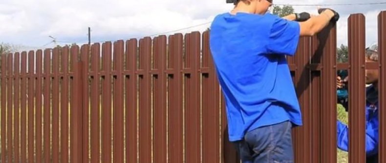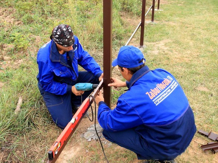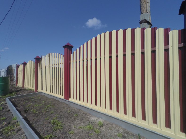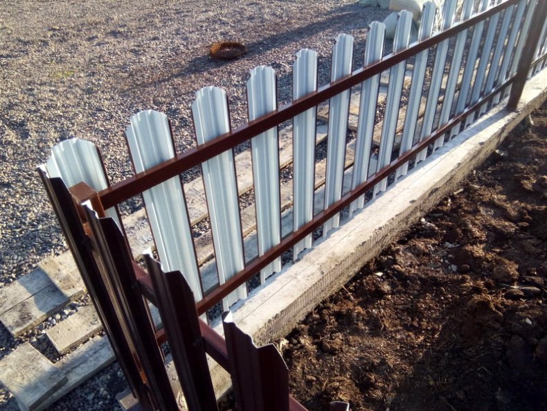 К столбам закрепляется металлический профиль в 2 ряда – приблизительно на удалении 1/5 высоты евро штакетника сверху и снизу. Работа проделывается по схожей схеме, что и с обычным штакетником.