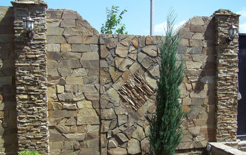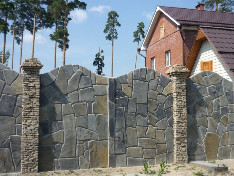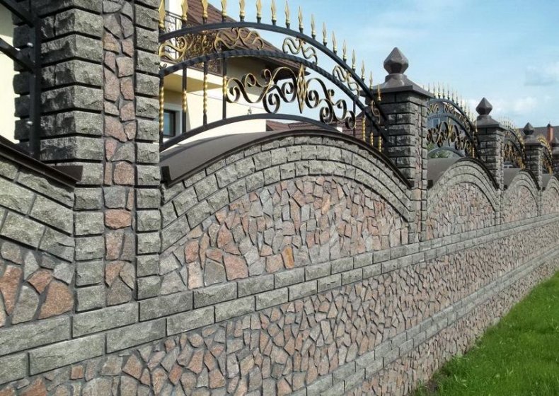 Для украшения ограды приобретается искусственный или натуральный камень – из ракушечника или песчаника. Однако стоит он дорого.