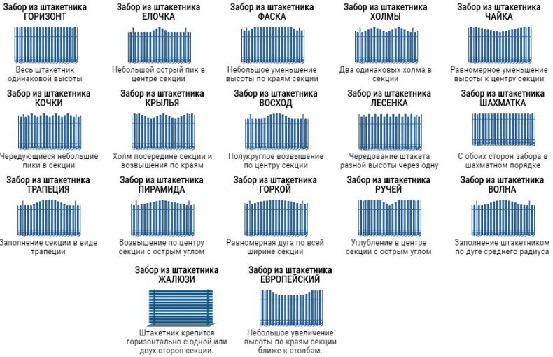 - Штакетник – детали закрепляются на некотором расстоянии друг от друга. Выглядит утончённо, с лёгкостью сопротивляется ветровым нагрузкам, а сырья понадобится меньше всего. Из-за щелей будет видно посторонним всё, что происходит на участке;
