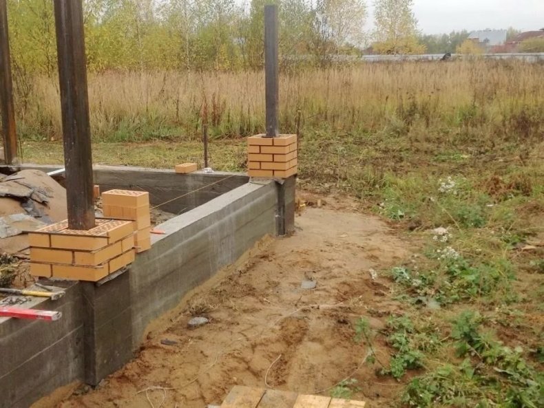- На выбор хозяина можно использовать: Опоры из кирпича, большое монолитное основание или раздельные металлические трубы на сваях.