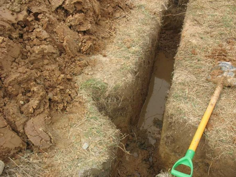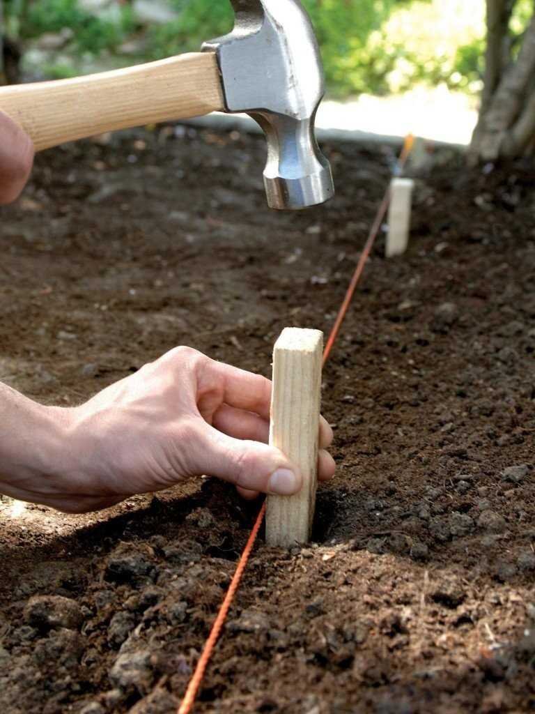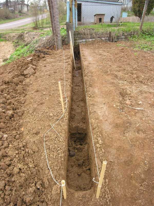 - Размеры и форму надо хорошенько обдумать, а для ровности канавы применяется натяжка шнуром между кольями.
