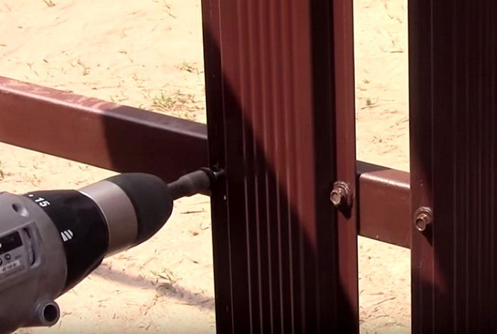 Крепление выполняется за счёт особых болтов с широкими шляпками. По ходу работы важно не повредить покрытие штакетника, в обратном случае скоро образуются делянки ржавчины, что сократит срок его службы.