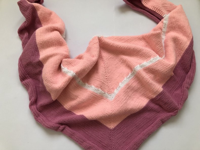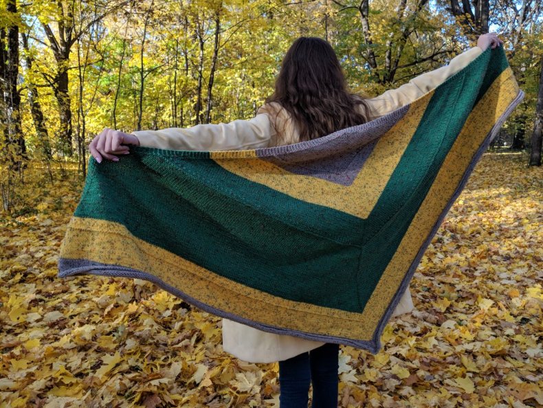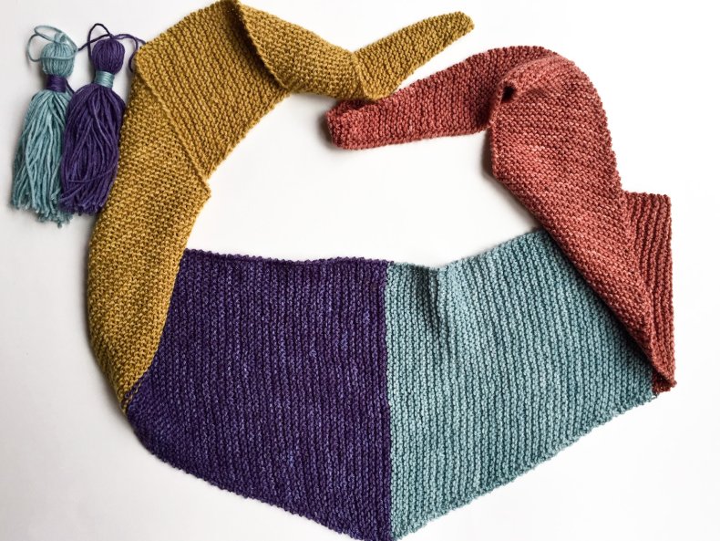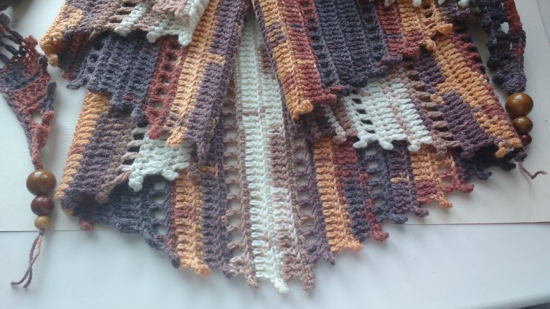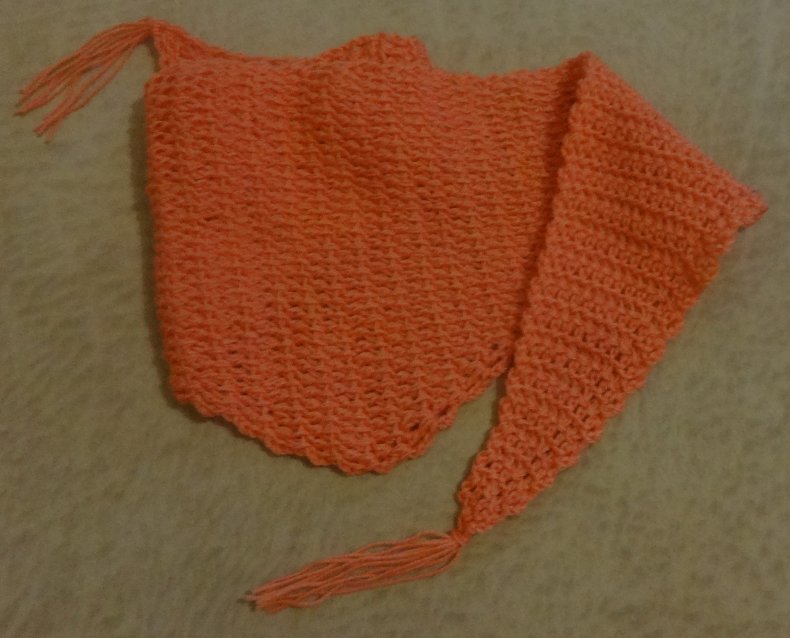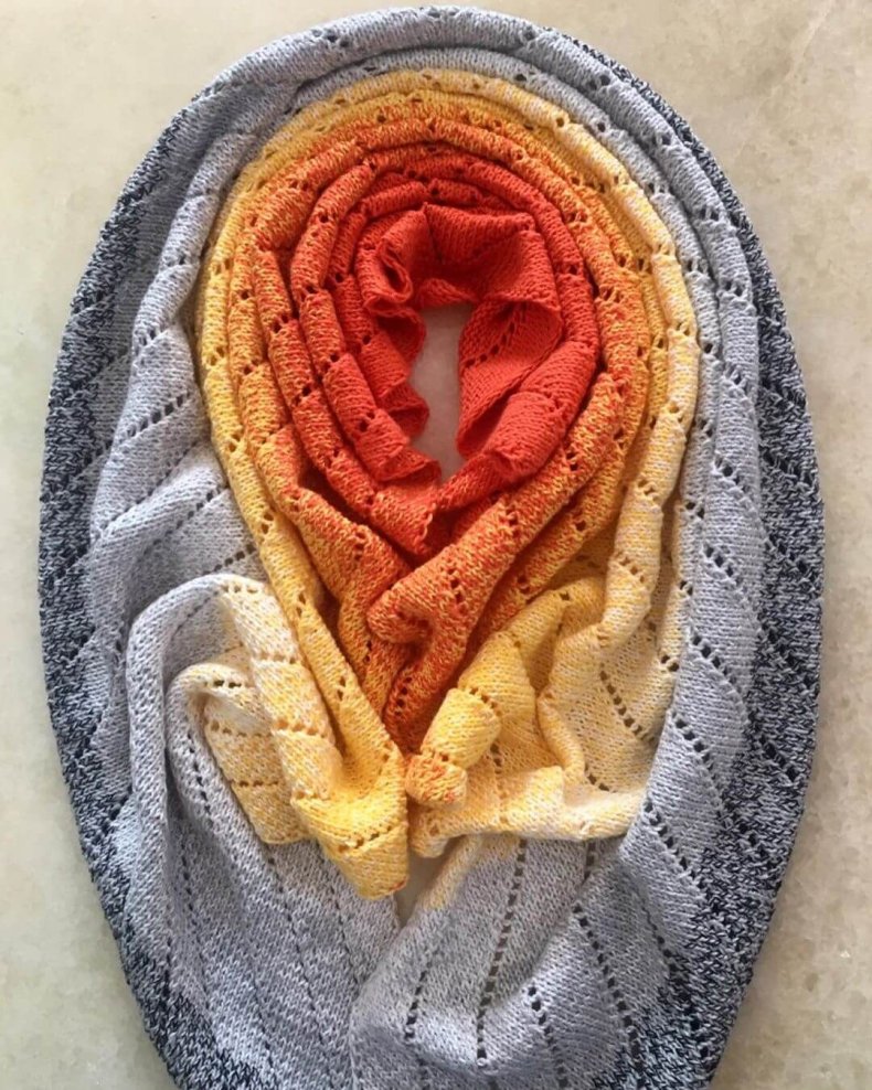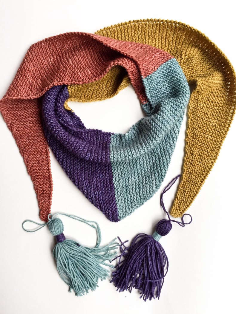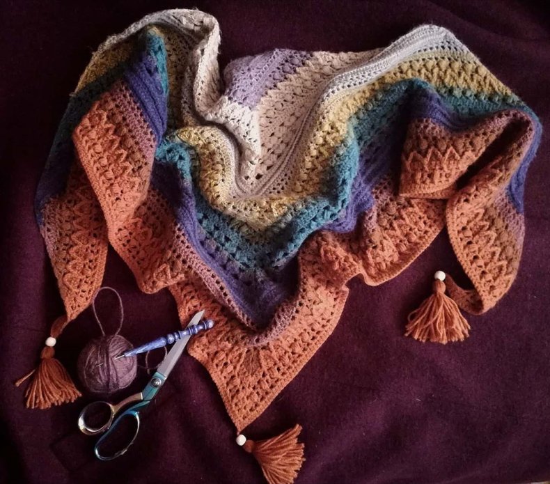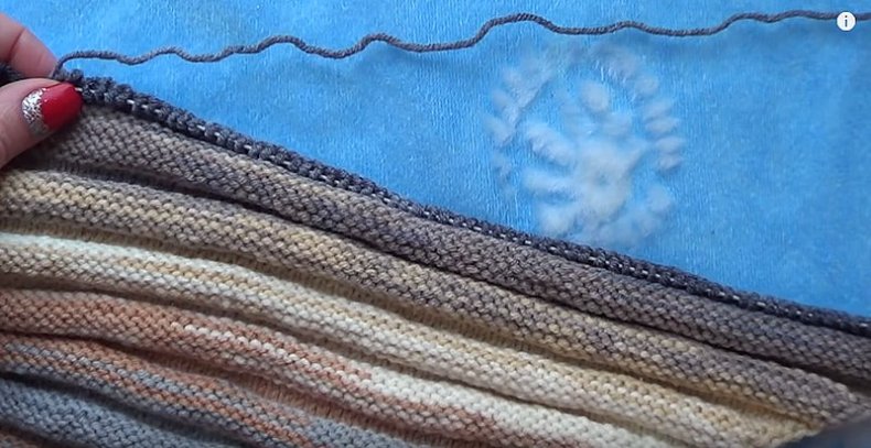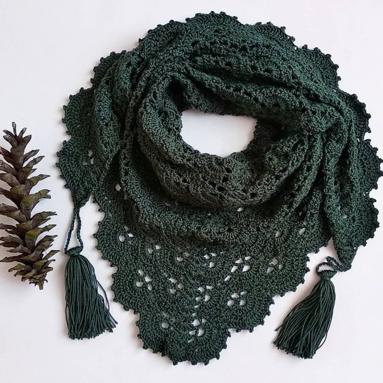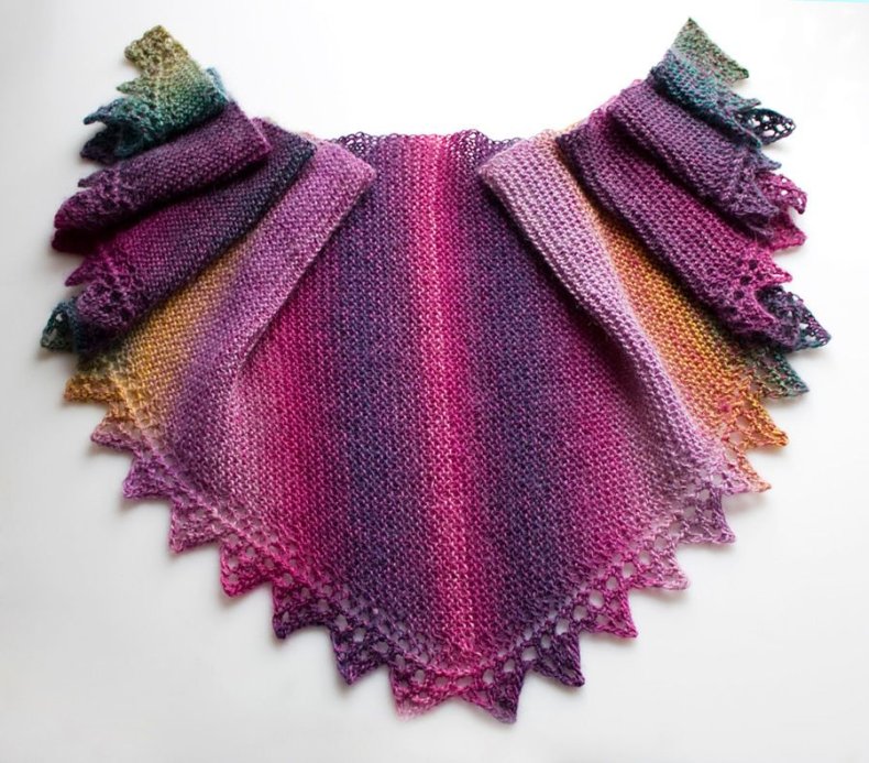 - Когда желаемая ширина будет достигнута, вы можете начать сжимать петли, чтобы в итоге получился треугольник. Как только все будет готово, остается оформить кромку. Для получения оригинала можно использовать волокна другого цвета.