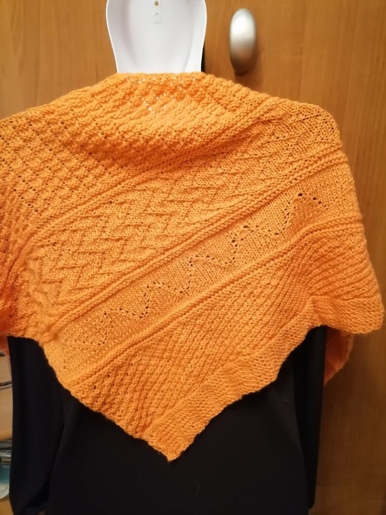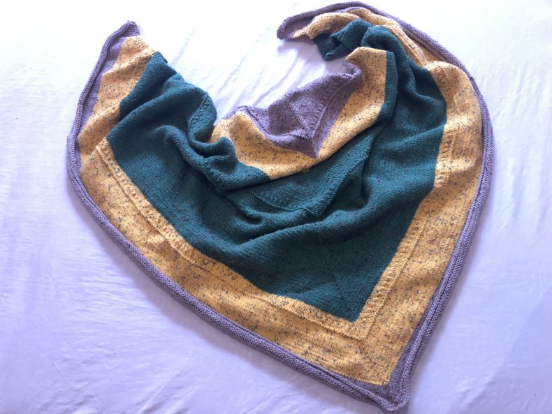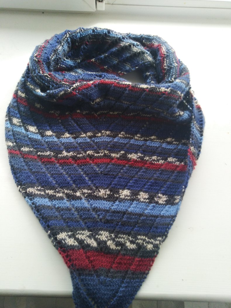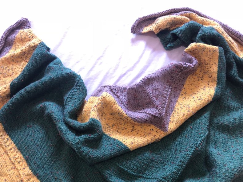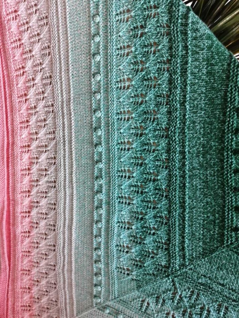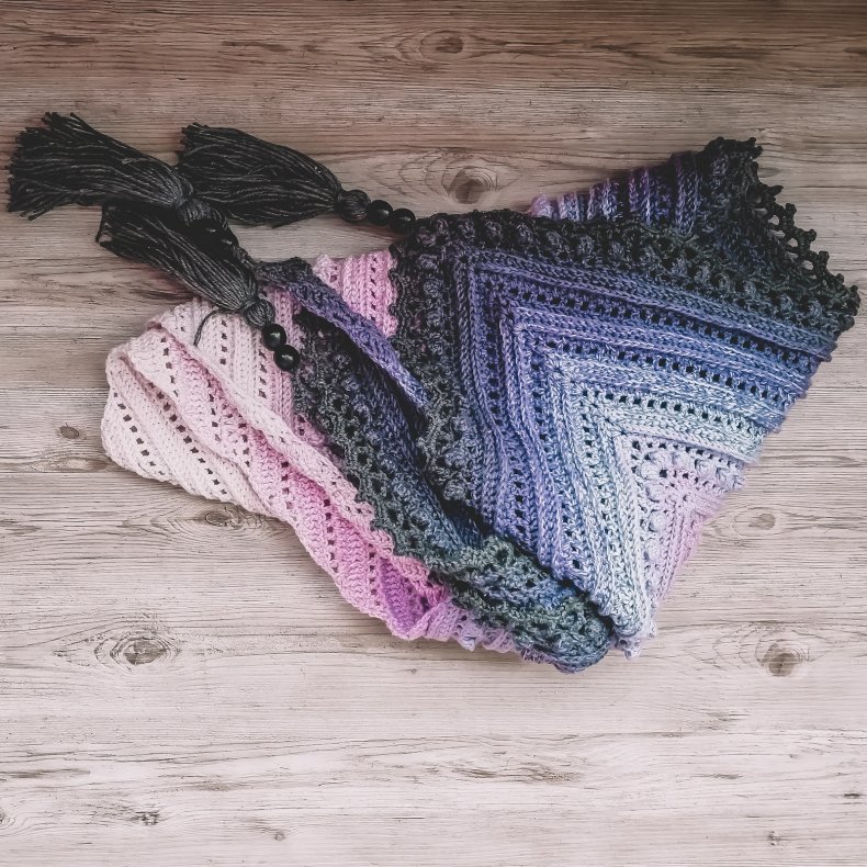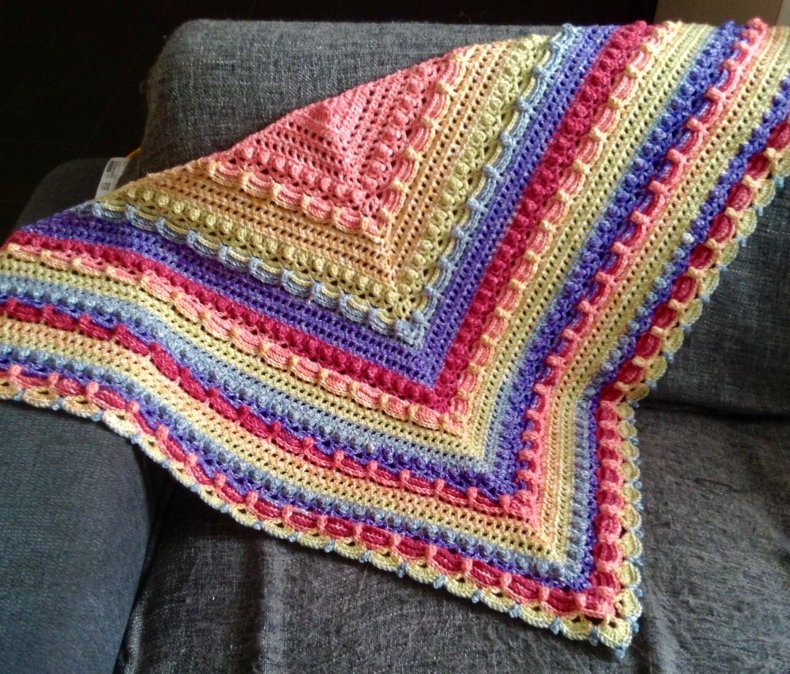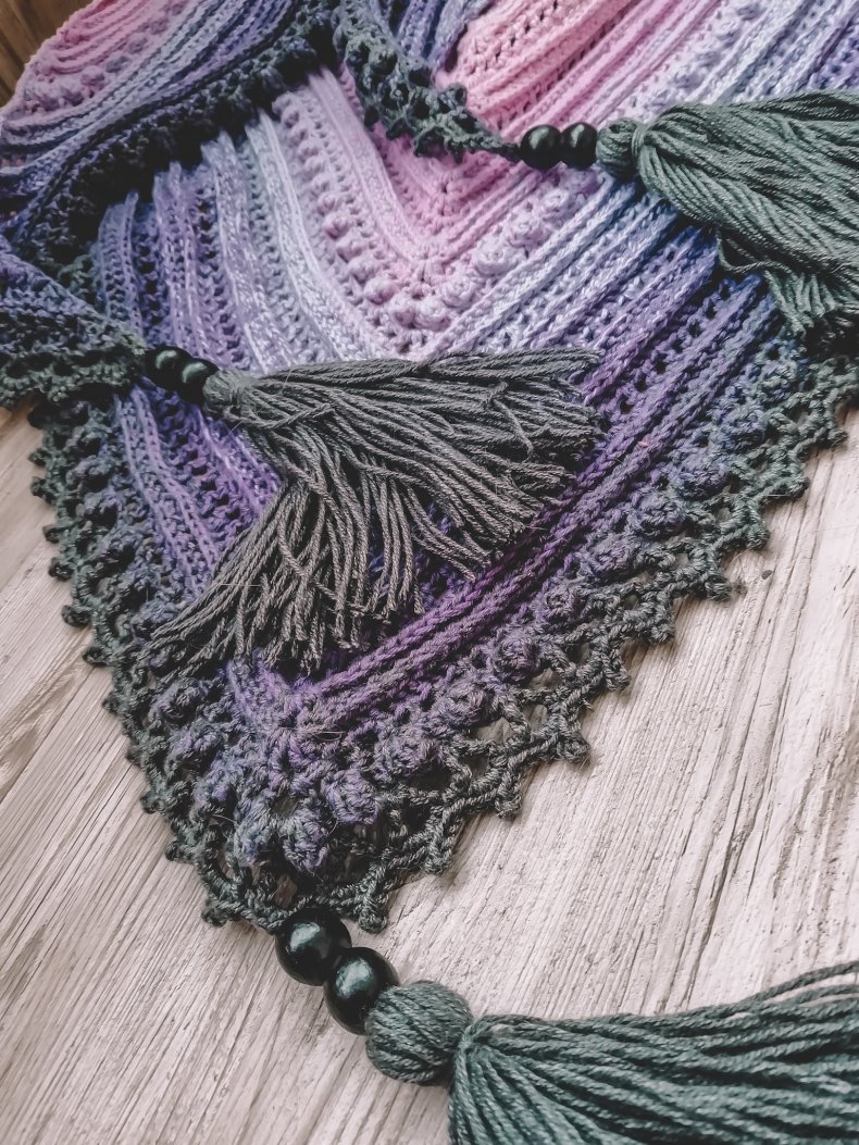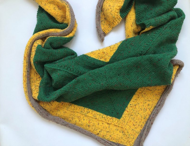 - Когда желаемая ширина будет достигнута, вы можете начать сжимать петли, чтобы в итоге получился треугольник. Как только все будет готово, остается оформить кромку. Для получения оригинала можно использовать волокна другого цвета.