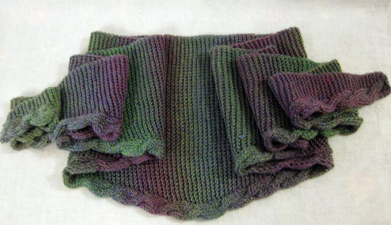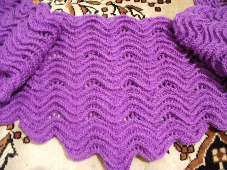 - Вы можете связать бактус с зубчатым краем на спицах, но в этом случае, особенно для обработки края, следует использовать крючок. Шарф, сделанный по приведенной выше схеме, можно связать красивыми зубчиками.