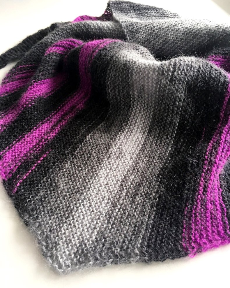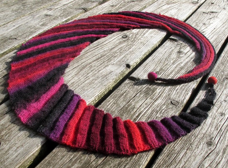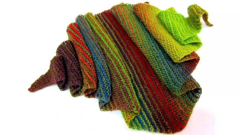 - Если хотите, чтобы шарф получился тоньше, нужно прибавлять петли через каждые 6 рядов. Следите, чтобы остальные петли были только с одной стороны. Что касается центра изделия, то он может быть острым или закругленным. Если вы выбрали первый вариант, сделайте убавку после добавления 4-х строчных петель.