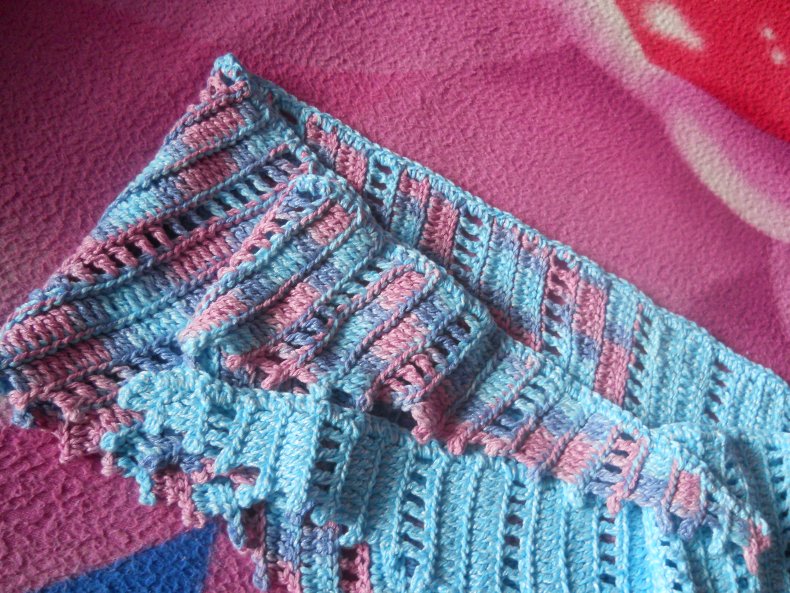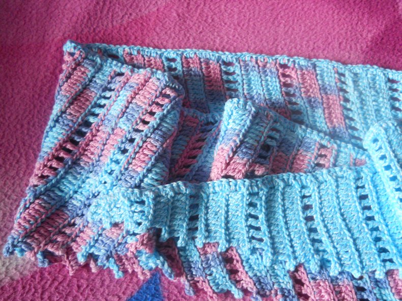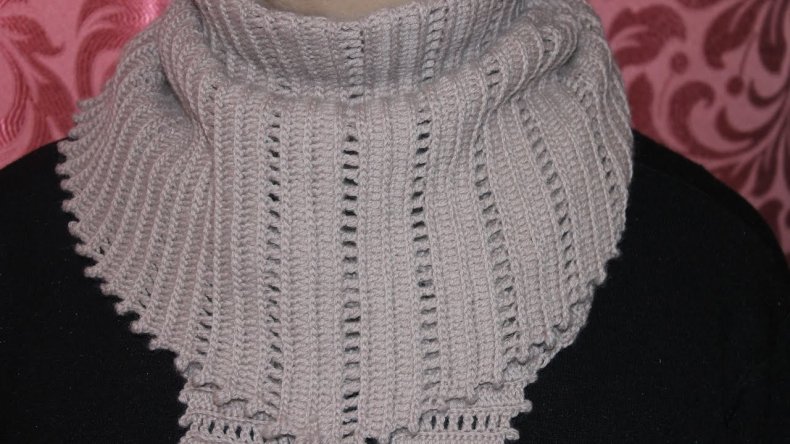 Украшаем край столбиками без накида и ВП. Сначала сделайте 2 простых столбика с накидом, а затем 3 вп. Осталось еще 9 столбиков без накида и 3 вп. Украсить таким оригинальным краем все изделие. В результате у вас получится красивый шарф.