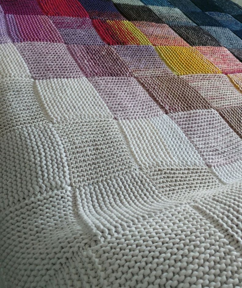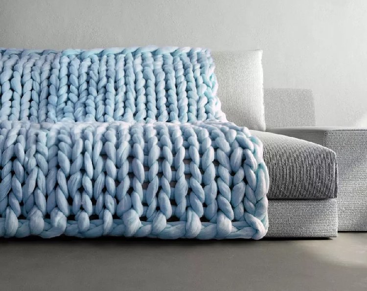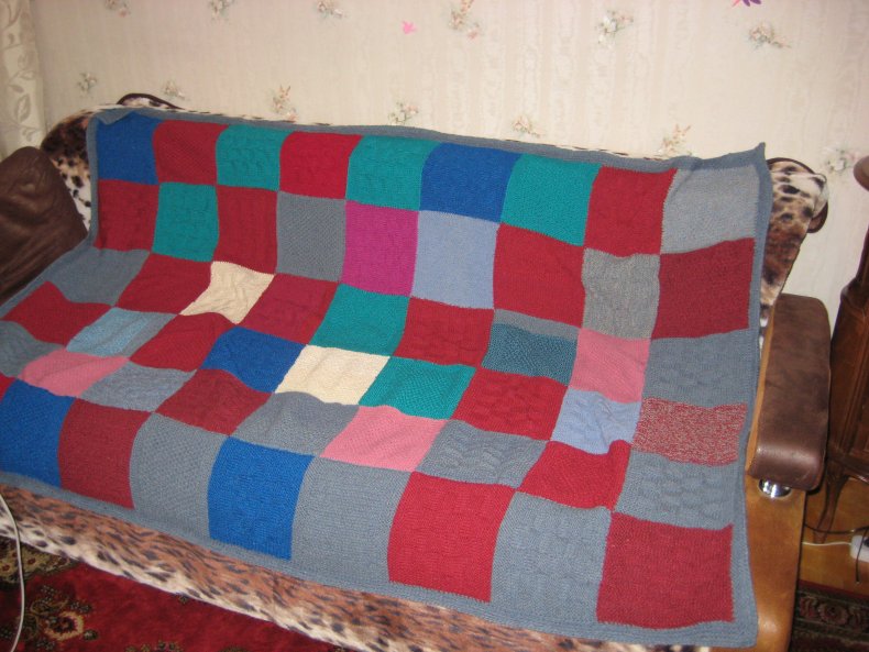 - Не надо заранее пасовать перед большими размерами. Самый сложный период – начало. Пледы вяжутся на толстых спицах, длина готового изделия прирастает быстро, и когда с каждым днём растущий кусок тёплого полотна начнёт постепенно прикрывать колени – работать станет легче и приятнее.