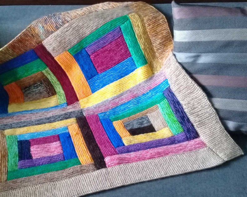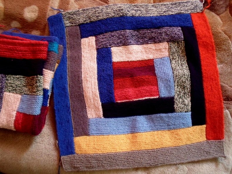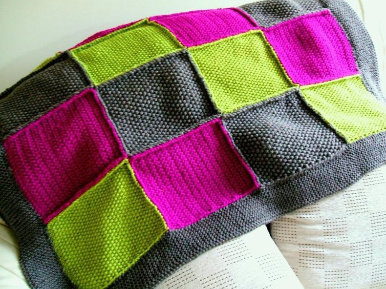- С узорами простыми и сложными, и комбинированные. Порой комплекс объединённых объёмных квадратов обрамляется каймой простейшей платочной вязки.
