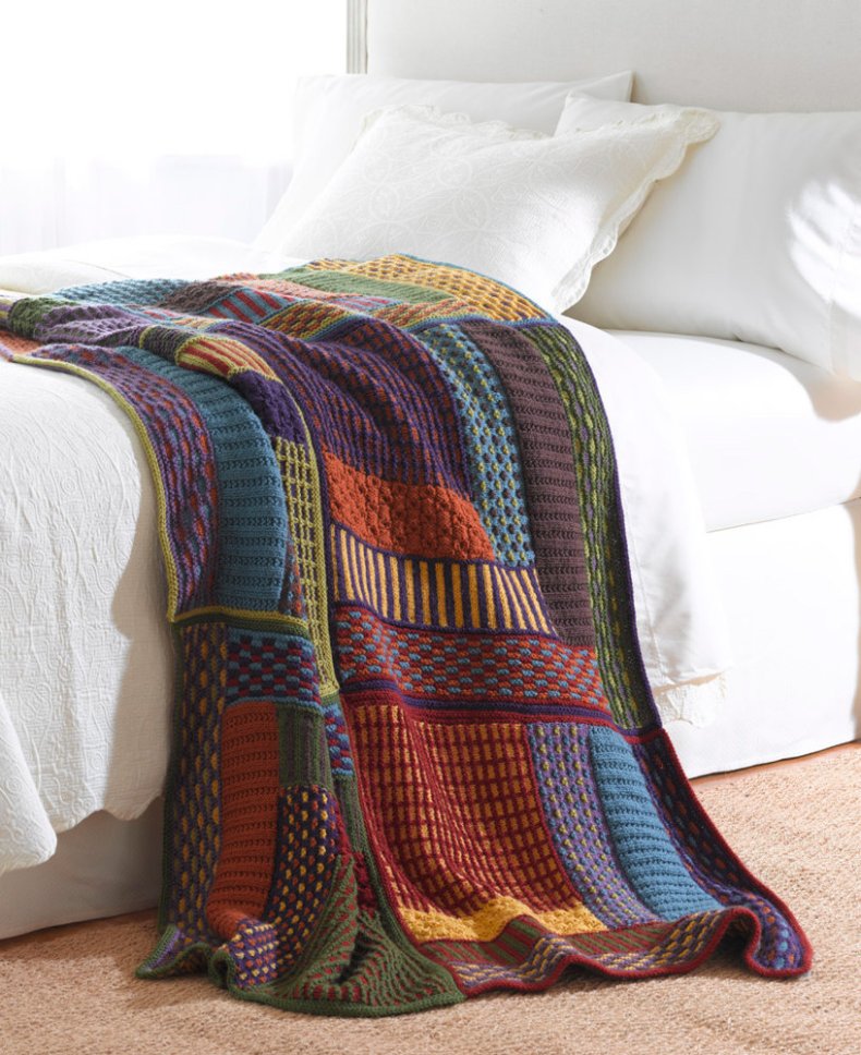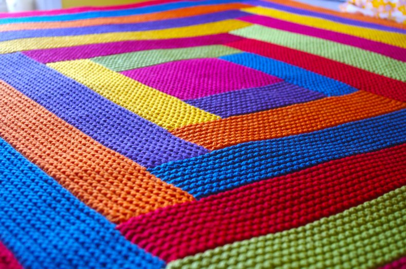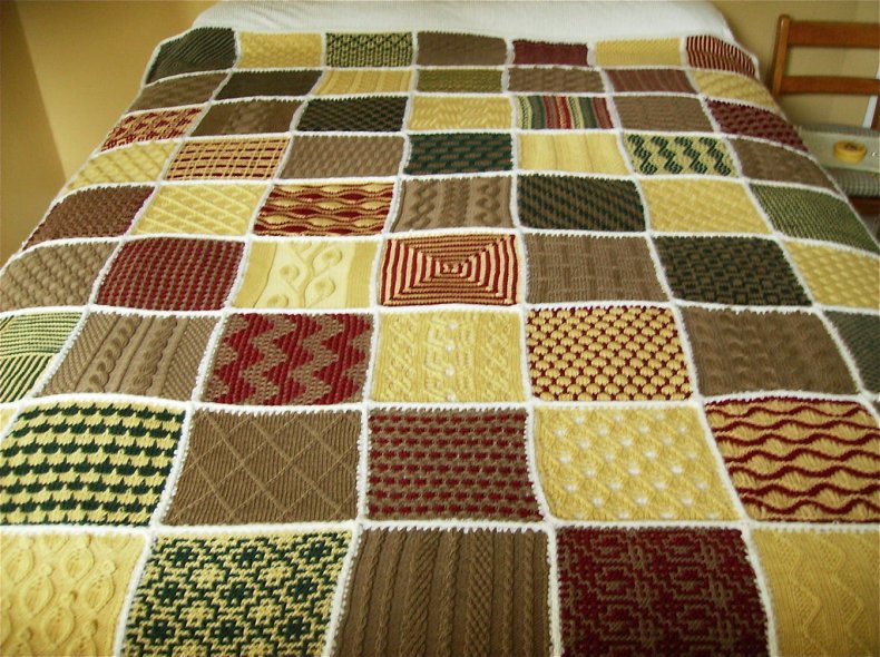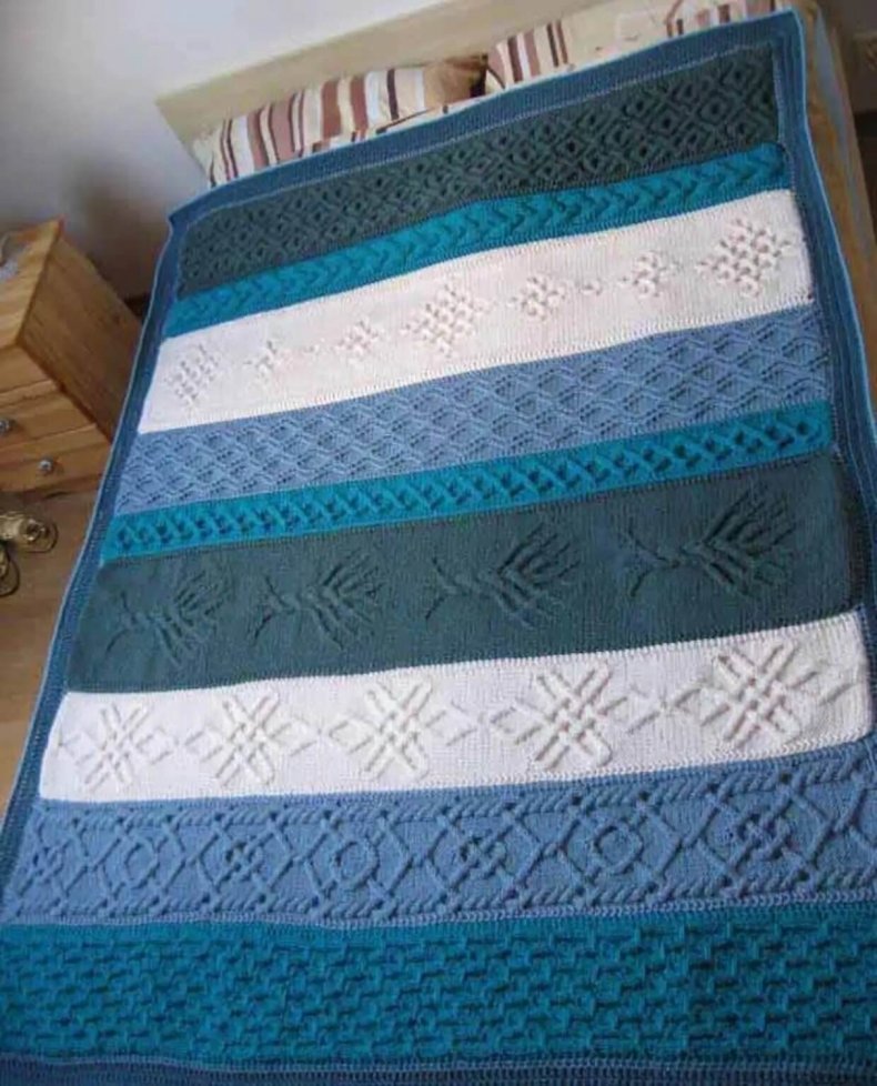 Цельновязаные либо составленные из отдельных модулей (квадратов, полос и прочих элементов. Есть даже исполняемые в технике пэчворк.)