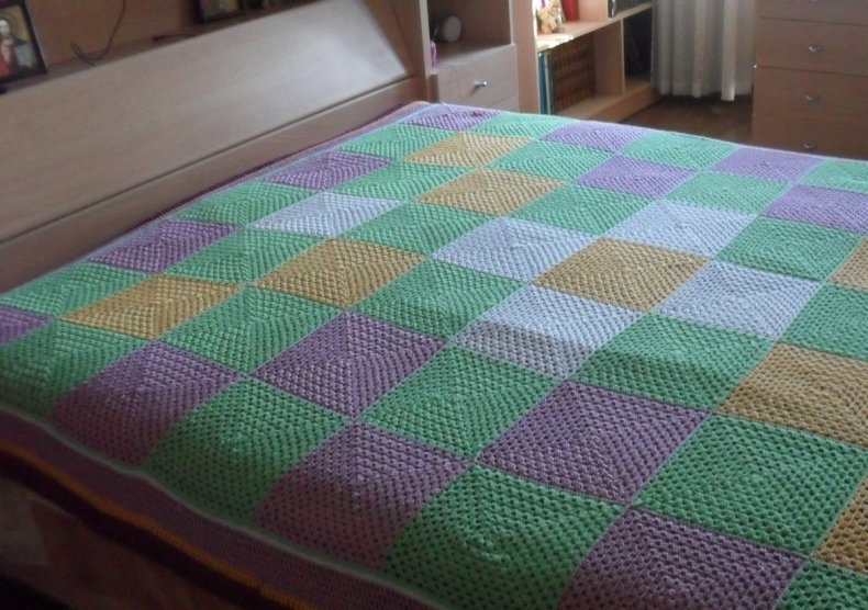 Важно: работая над большим цельновязаным полотном, нужно контролировать так называемую ровность вязания. Если покрывало будет начато «тугой», а закончено «слабой» вязкой , оно вместо прямоугольного перекосится в трапецию.