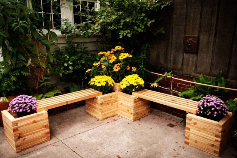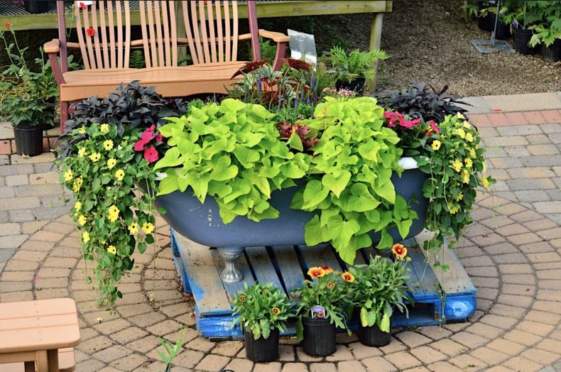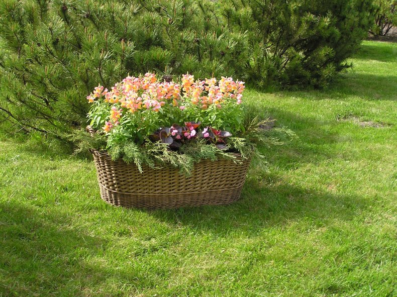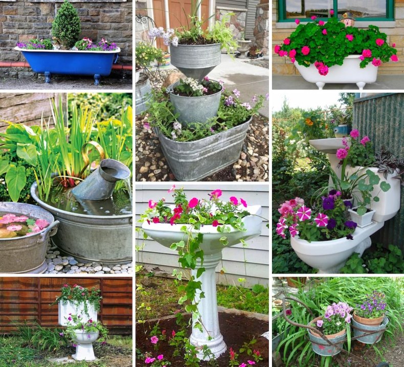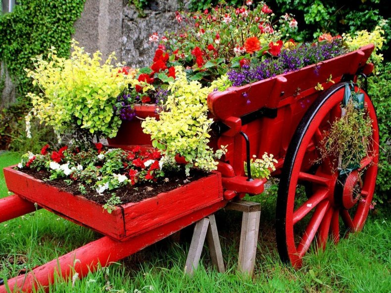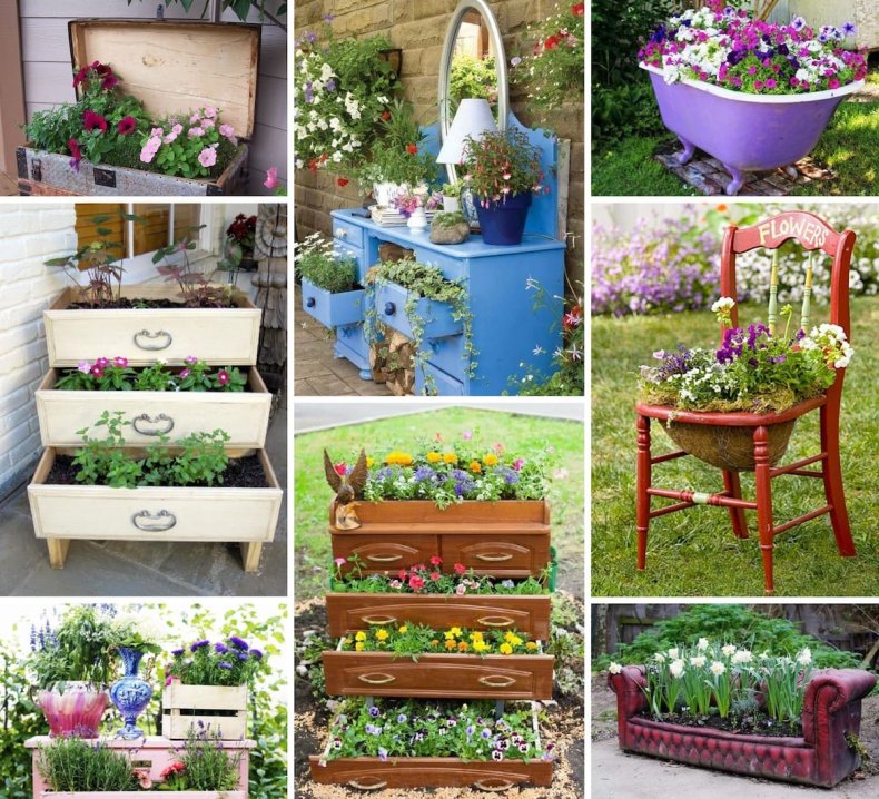 - Мебель. Старую мебель перед использованием покрывают влагозащитным раствором. Также её можно покрасить. Цветы можно размещать на кровати, ванной. Для таких целей также подойдёт старый автомобиль или велосипед. Неплохо выглядят в качестве клумбы чайники, кастрюли или даже зонты. Словом, всё что на ум придёт.